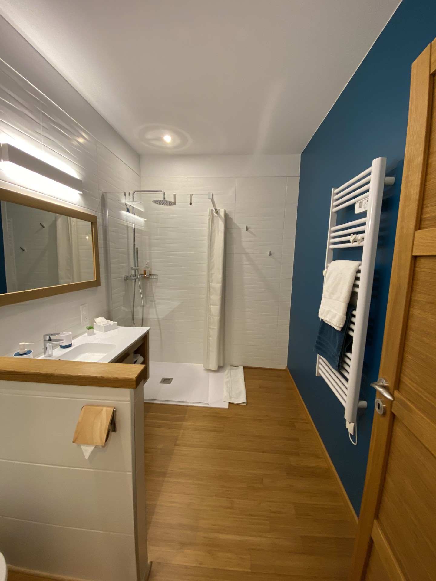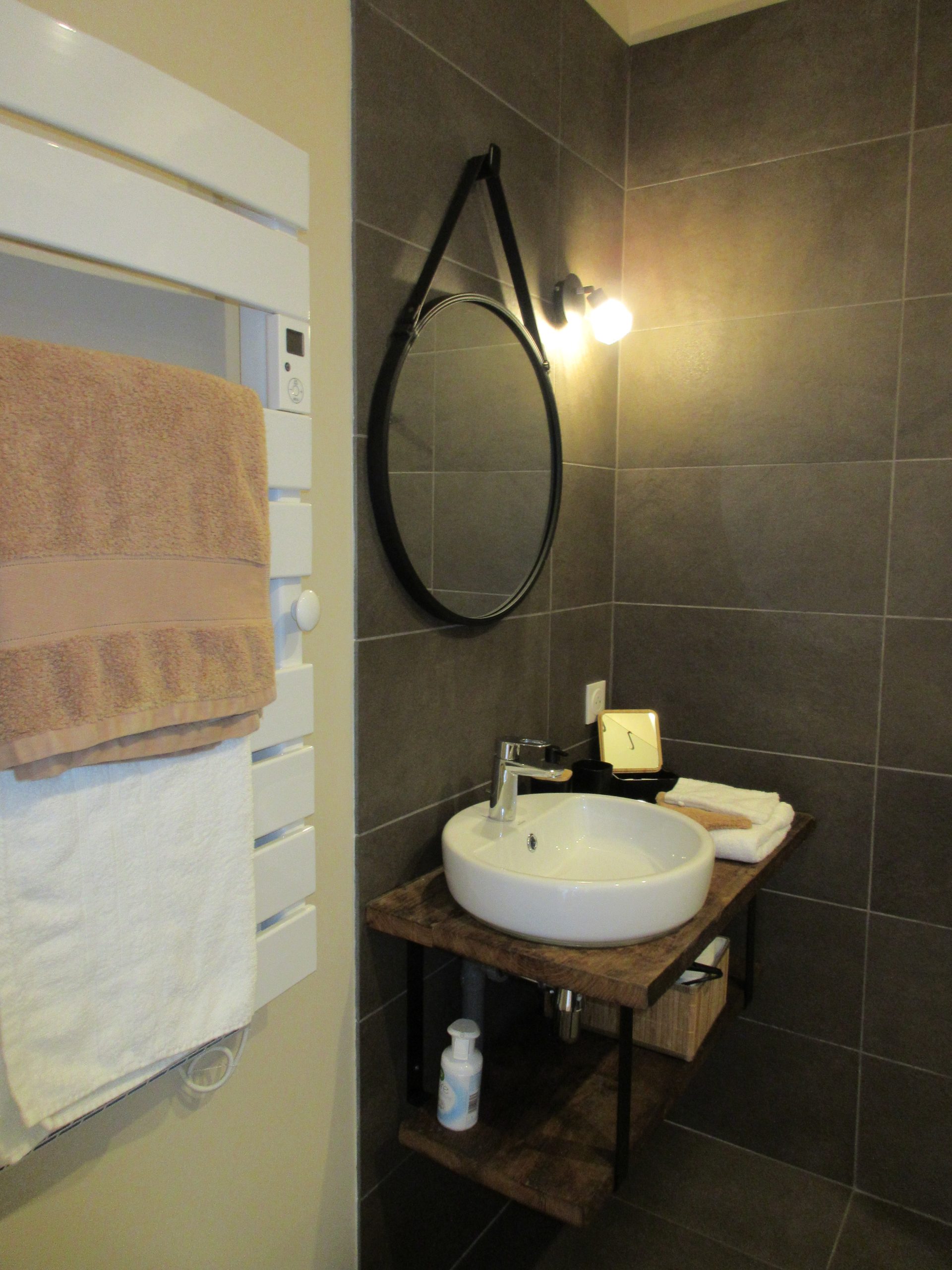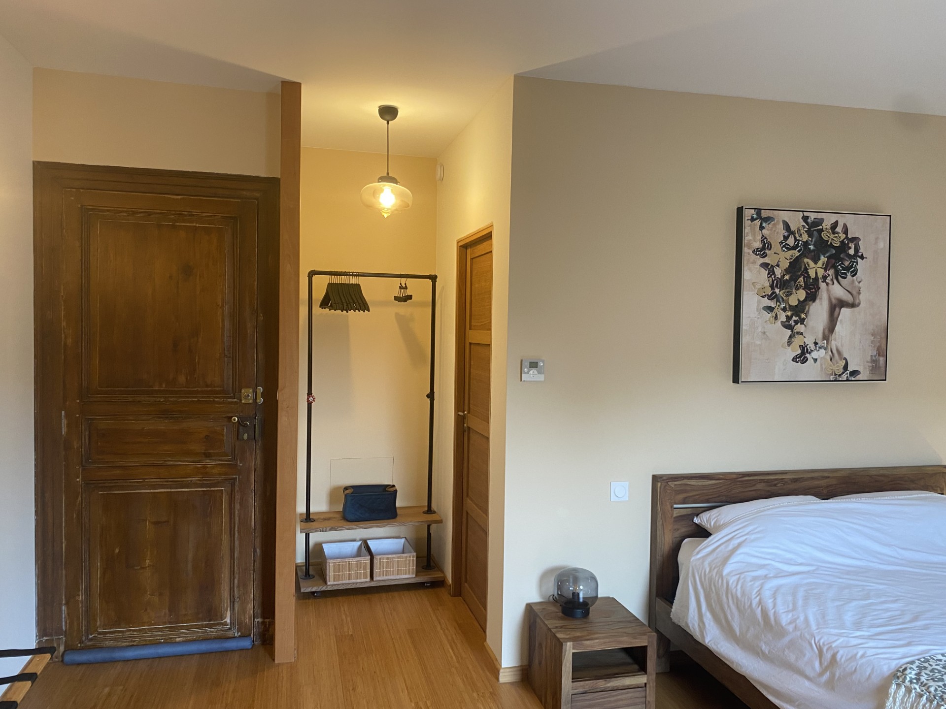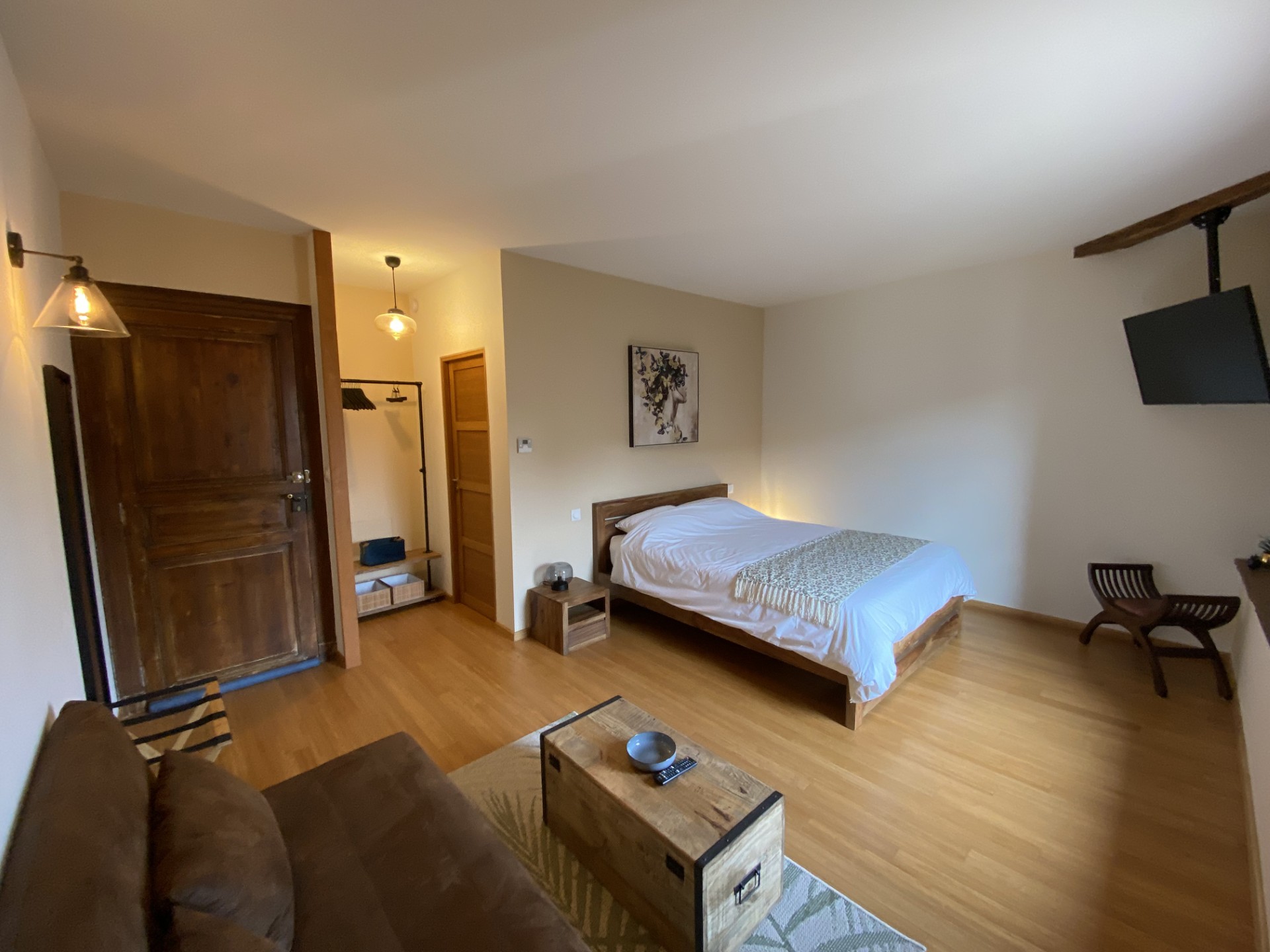 Lit de 160 cm et lit simple 90cm-Coin salon – Climatisation – TV 4K – WIFI gratuit – Vue sur la grange – Pour 1 à 2 adultes et 1 enfant ou 3 adultes – Grande salle d’eau indépendante avec toilette.