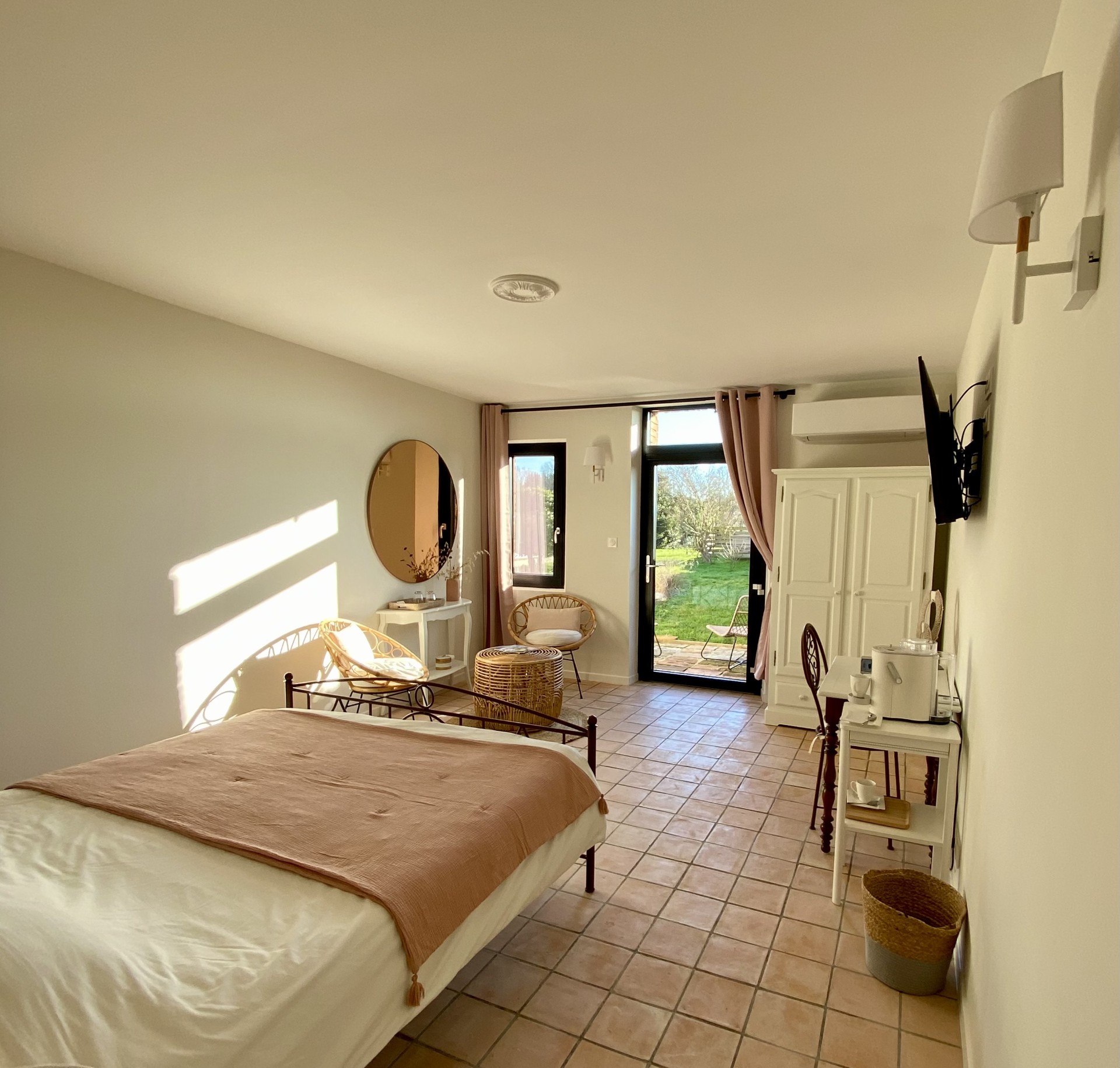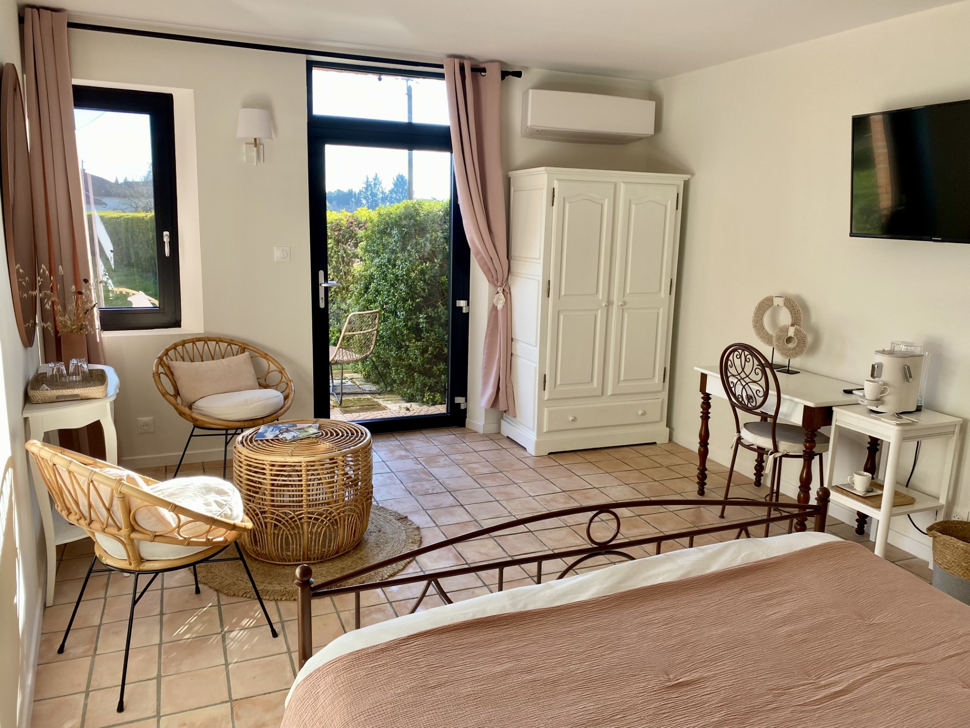 Lit de 160 – Salle d’eau privative – Toilette séparé – TV 4 K – WIFI gratuit – Vue sur le jardin et piscine – Set café et thé à disposition.