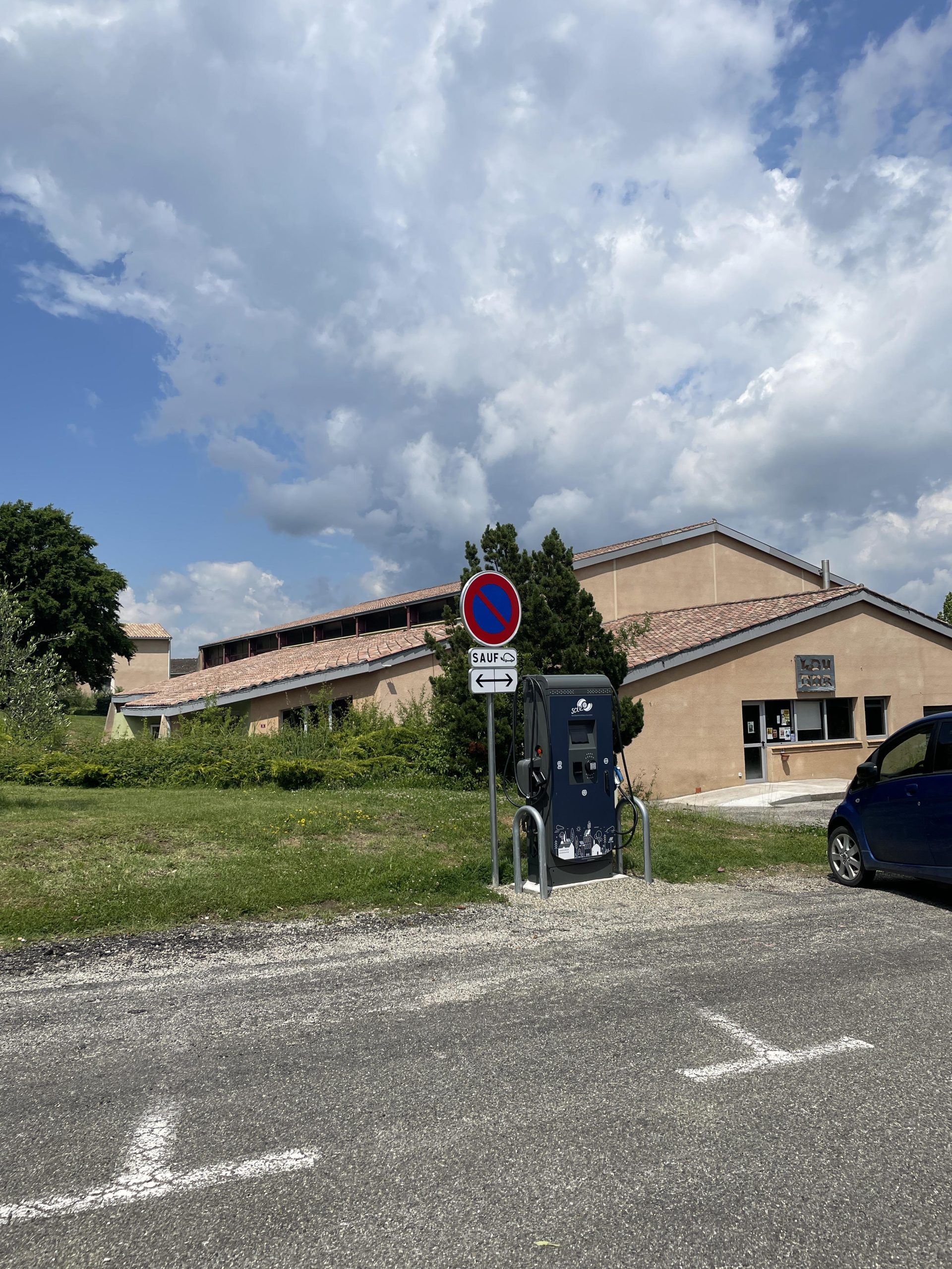 Borne de recharge pour véhicules électriques avec deux places de parking. Service accessible 24h/24. Réseau SDE82. Places non couvertes.