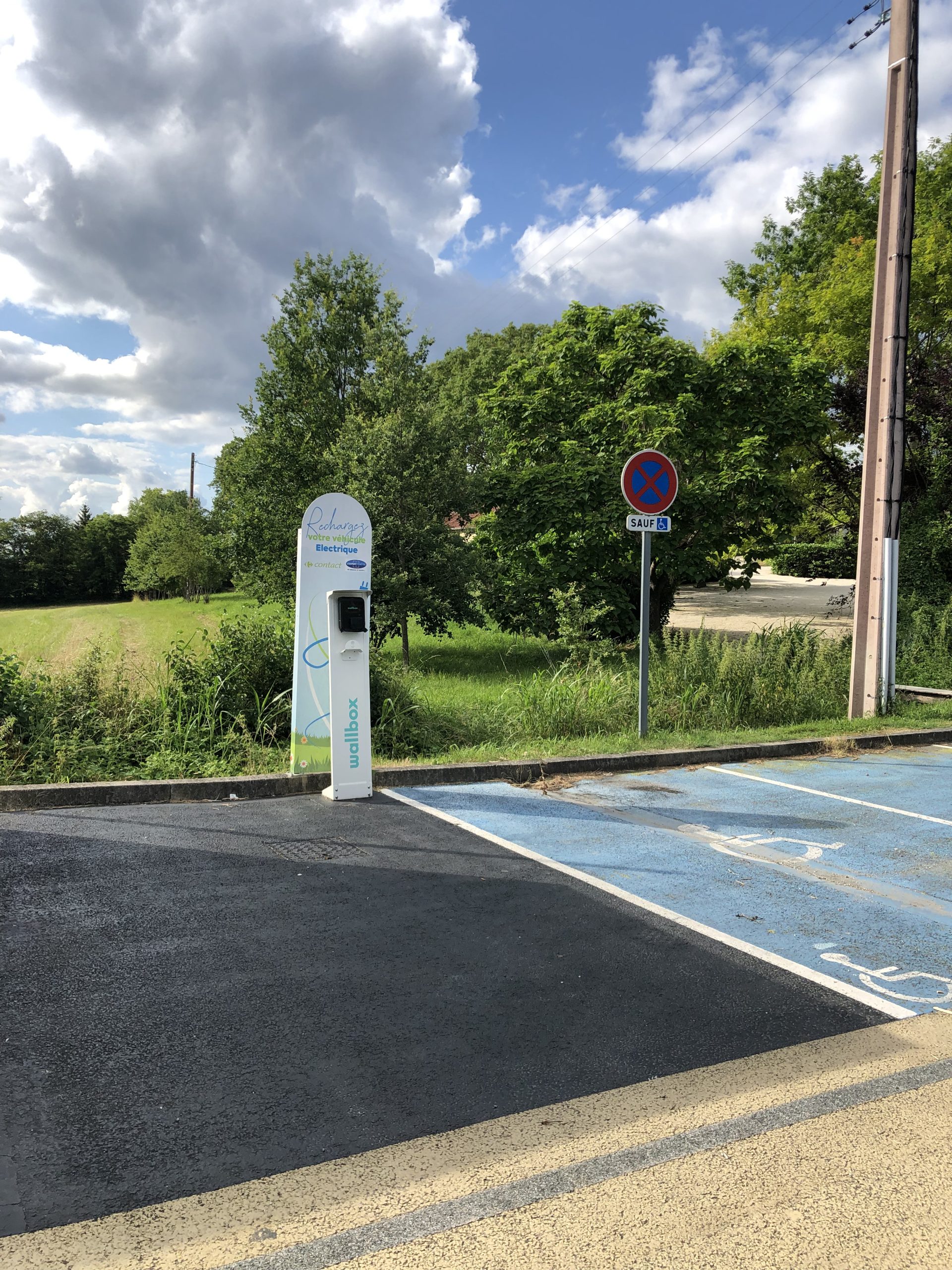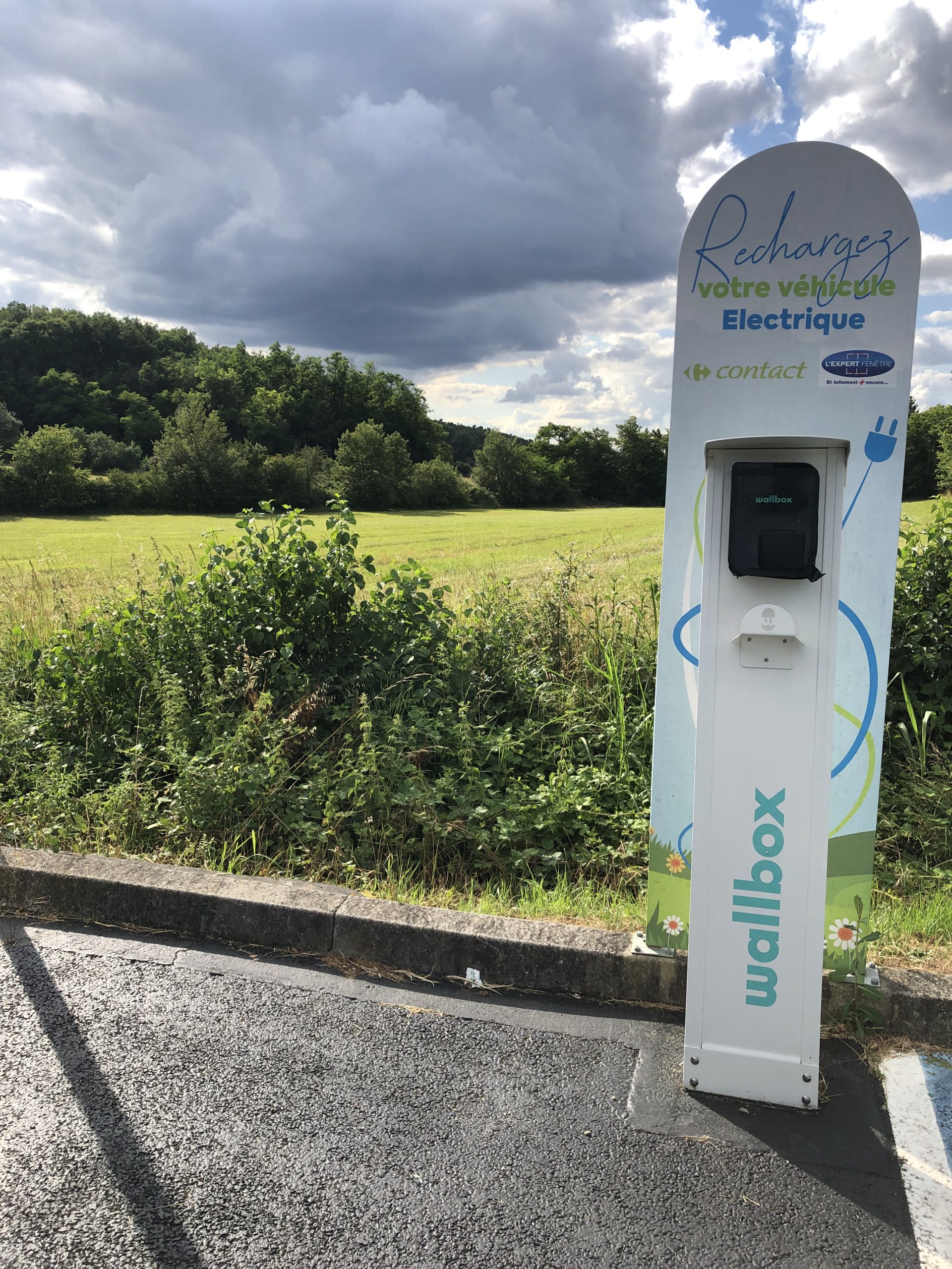 Borne de recharge pour véhicules électriques Wallbox sur le parking Carrefour Contact à Lafrançaise. Prise Type 2.