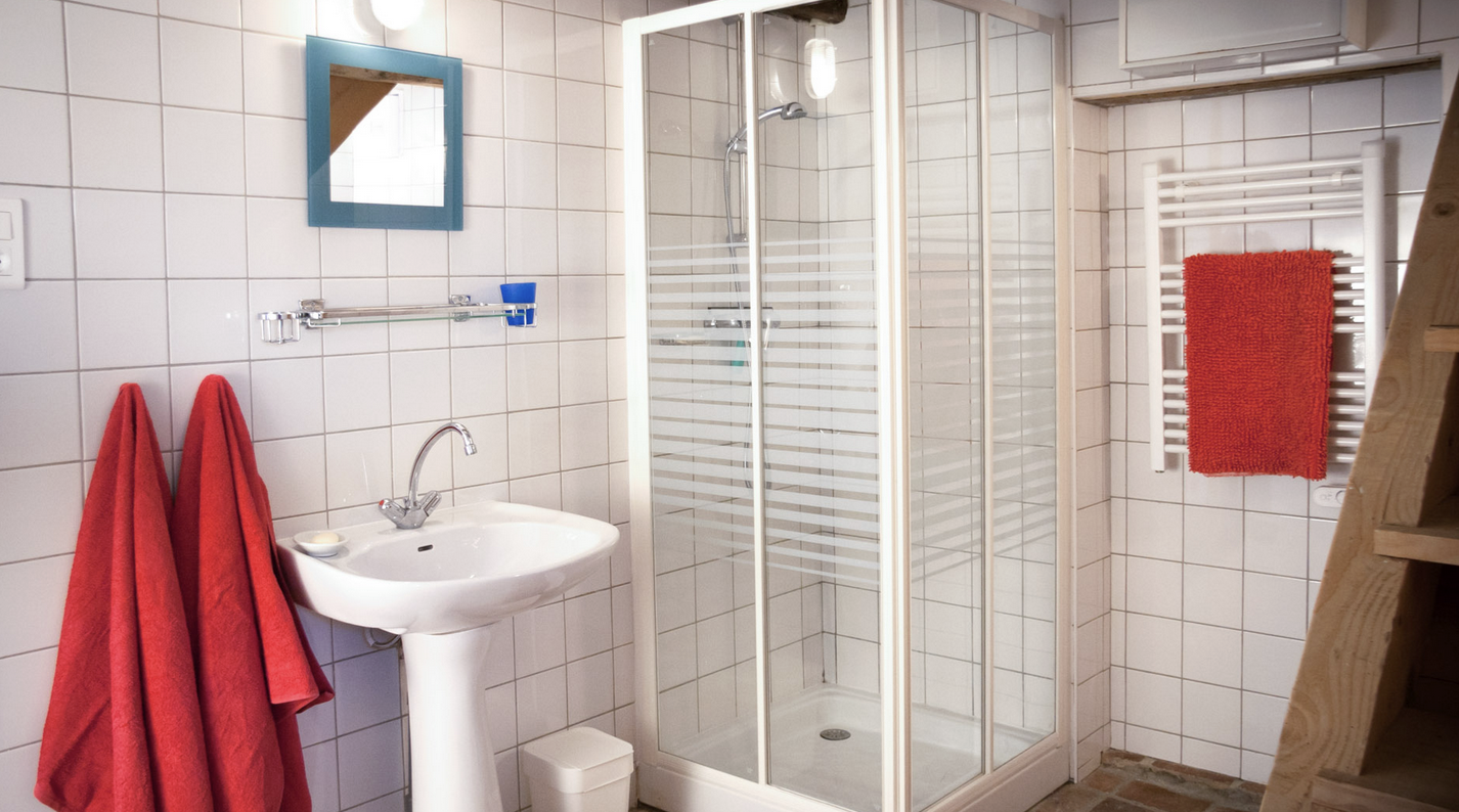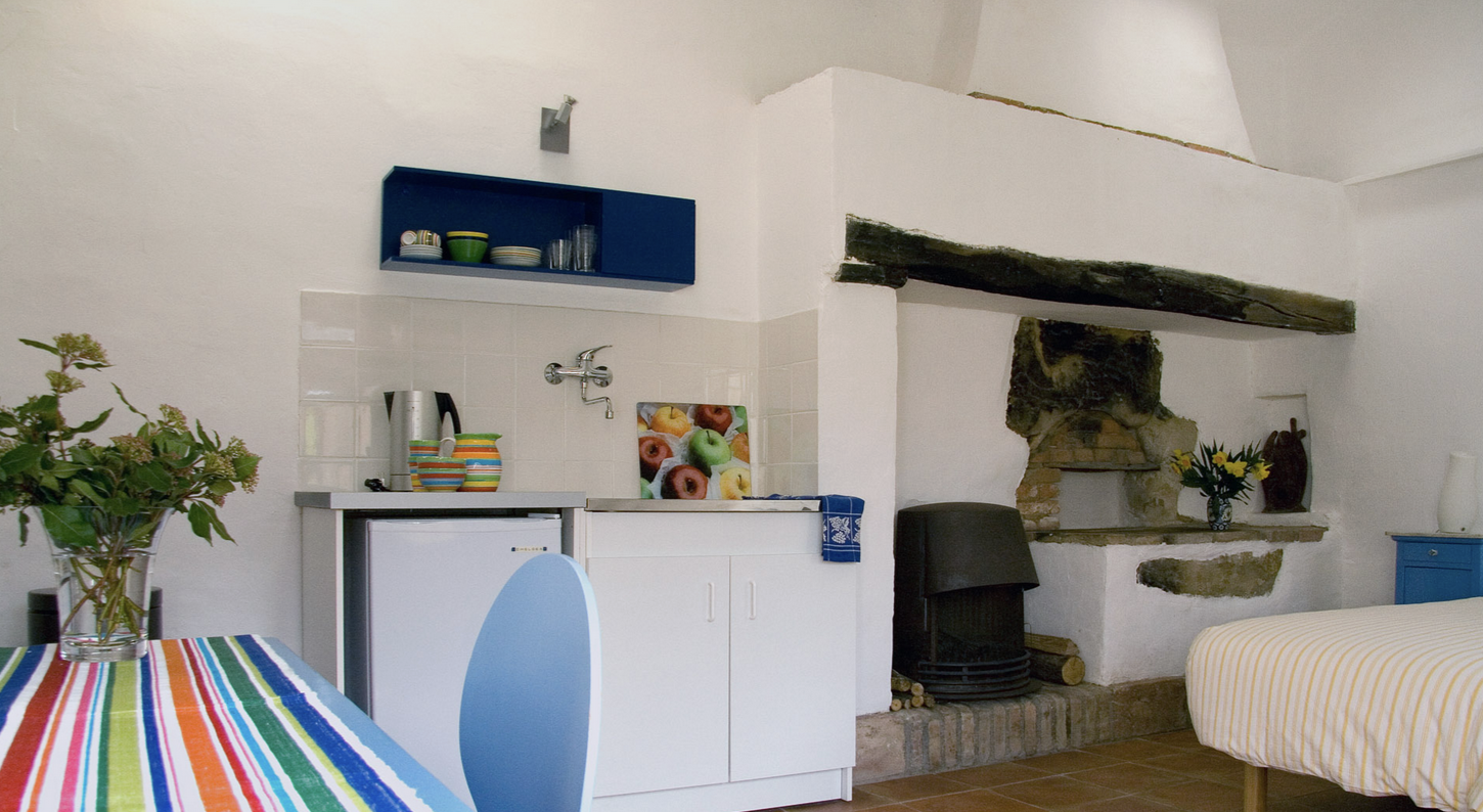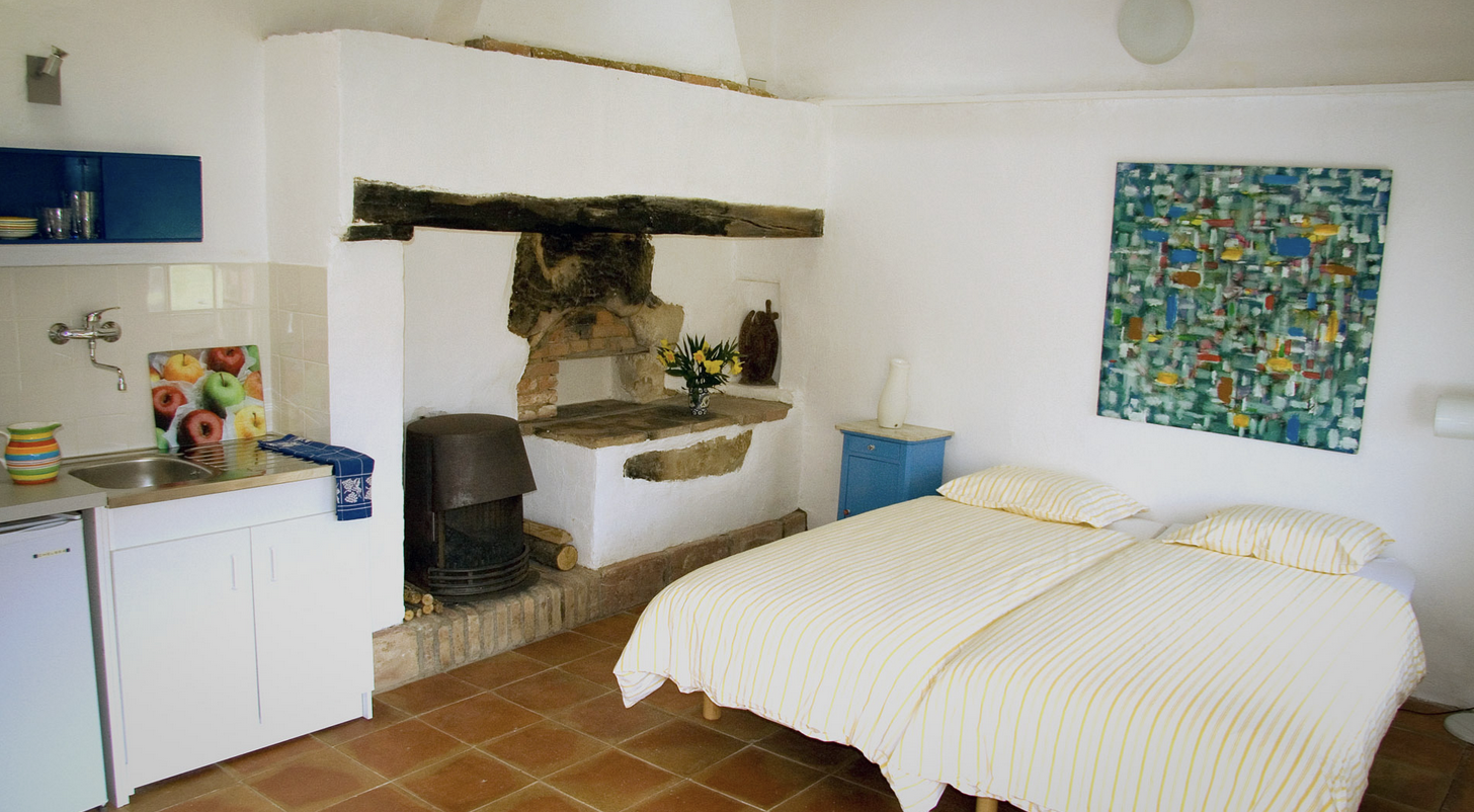 La chambre dispose de 2 lits à une place, un poêle à bois, un chauffage électrique, où on peut faire du thé ou du café, un réfrigérateur et une table avec des chaises. De là, il y a un passage vers le pigeonnier qui a été transformé en salle de bain. Il y a une douche, une toilette et un lavabo.