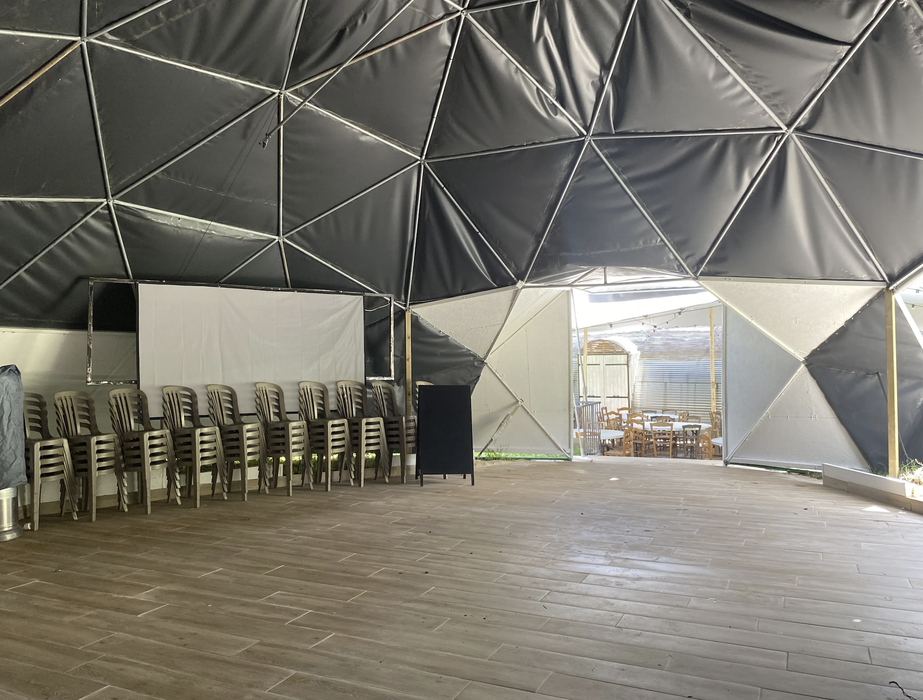 Le respect de l’environnement au cœur de votre réception et à l’image de votre réception, prenez votre repas sur la terrasse couverte avec vue à 180° sur la nature, une piste de danse de 90 m² et commodités attenantes.