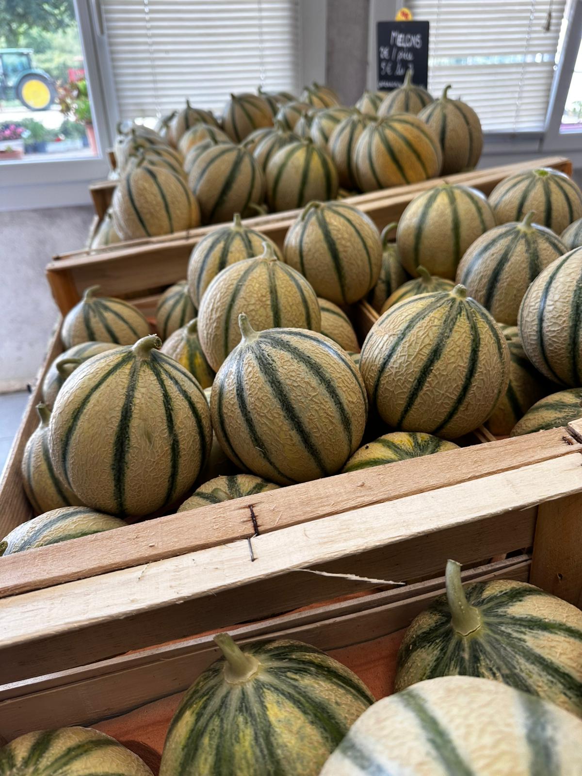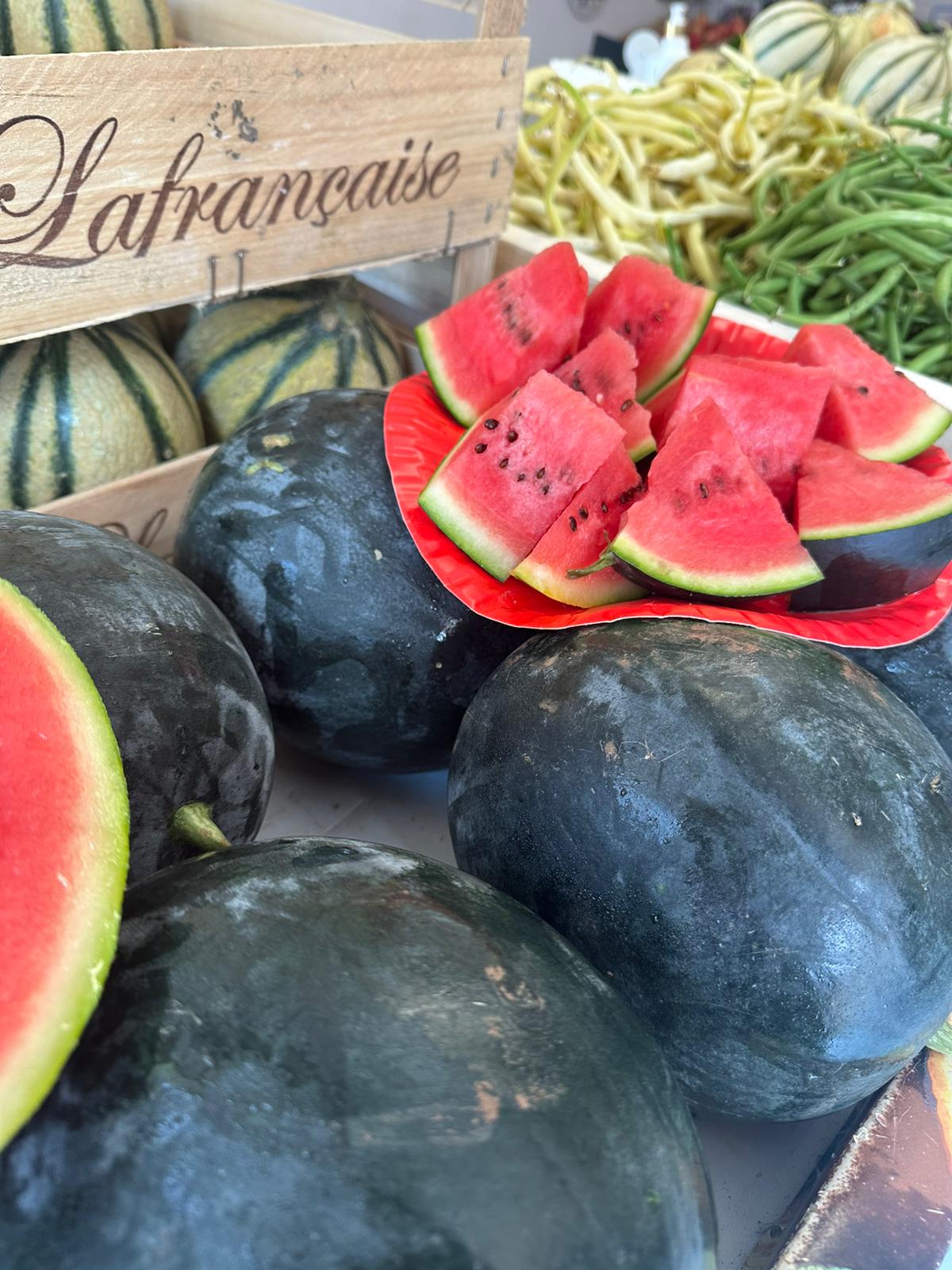 Fruits : melons, pastèques, tomates, pommes (Fuji, Canada, Chanteclerc, Gala, etc.), fraises, kiwis jaunes et verts.