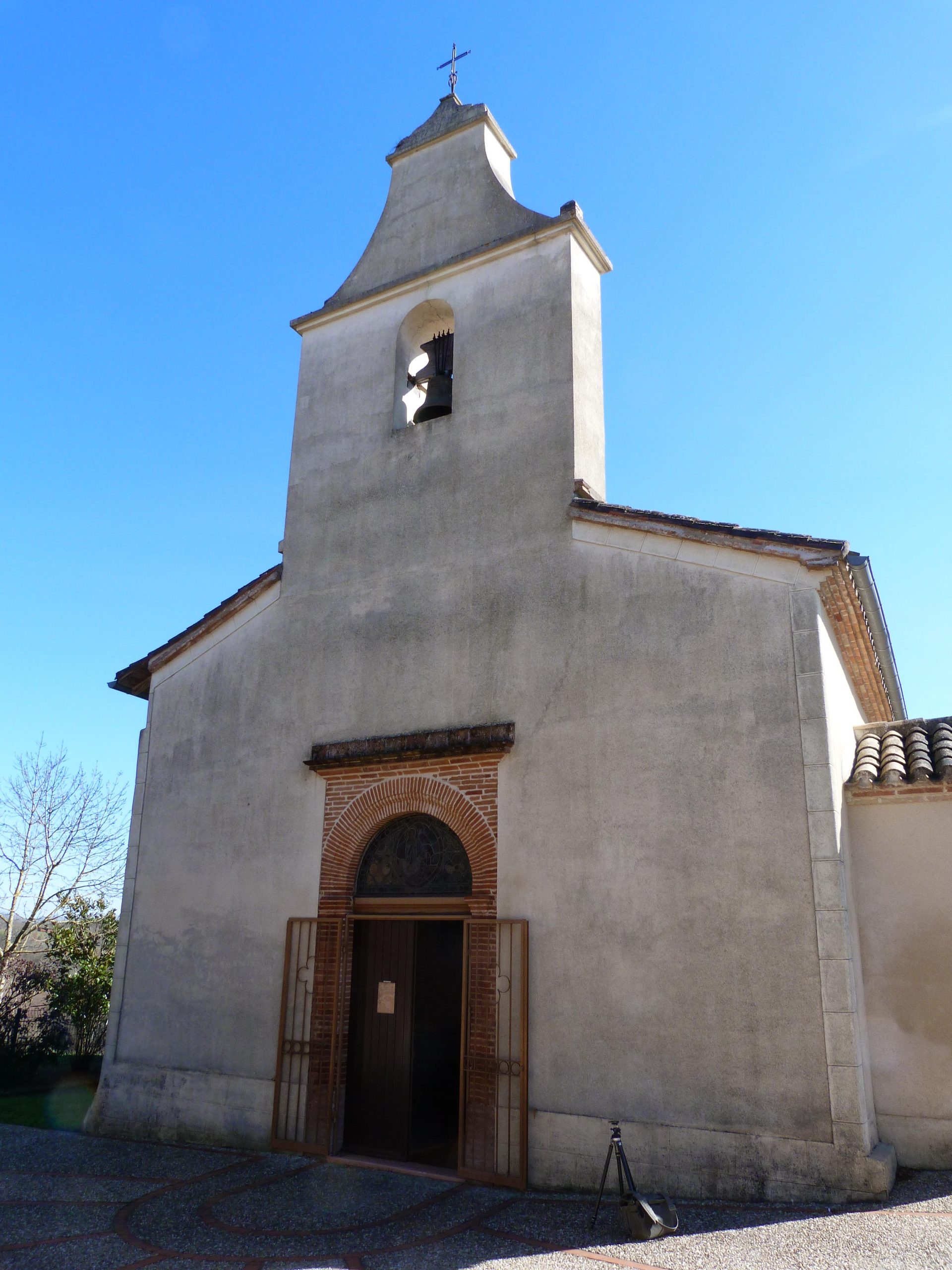 Consacrée au martyr d’Antioche, l’église actuelle est en grande partie une reconstruction du XVIIe siècle puisque, comme de nombreuses autres églises du Bas-Quercy, elle eut à souffrir des guerres de Religion dans la deuxième moitié du XVIe siècle et la première moitié du XVIIe siècle. De l’église médiévale demeure cependant un magnifique armarium (ou armoire liturgique) dans le mur du chœur, richement décoré d’un arc en accolade et de pieds-droits sculptés. Cet encadrement est caractéristique de l’art flamboyant de la fin du Moyen âge. Aujourd’hui recouverte d’un enduit, l’église ne laisse apparaître que des baies encadrées de briques foraines, mais par endroits un soubassement en pierre est encore visible.