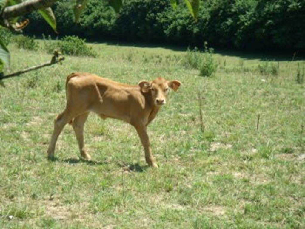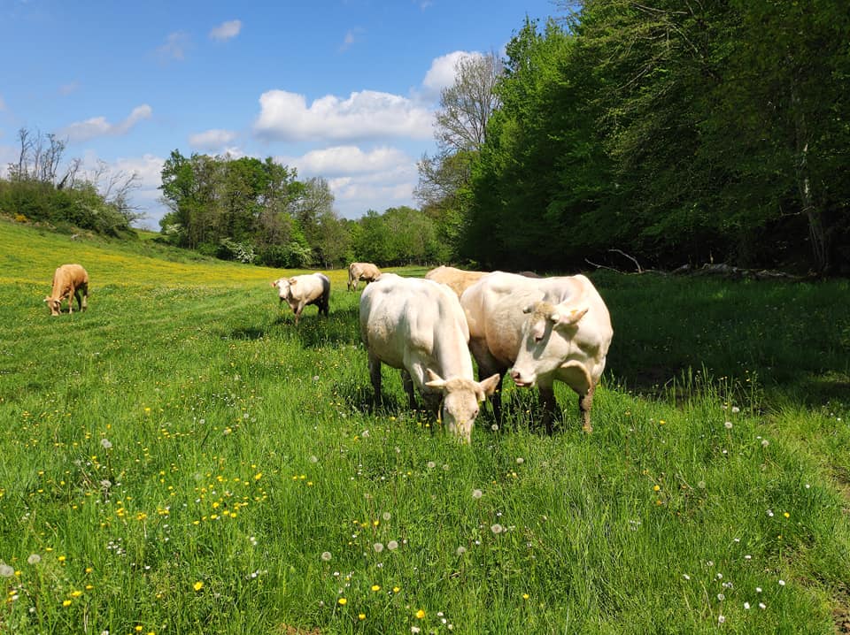Productions de la ferme : Troupeau de vaches Blondes d’Aquitaine, porcs élevés à la ferme.