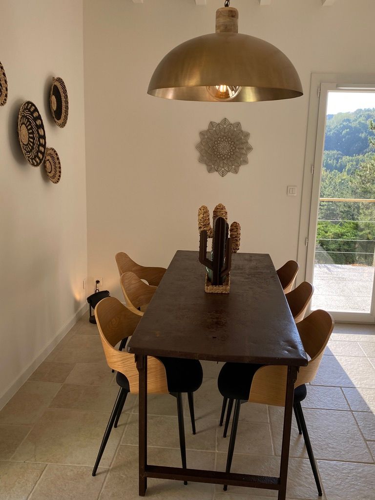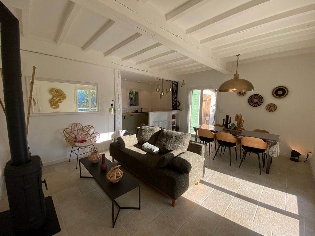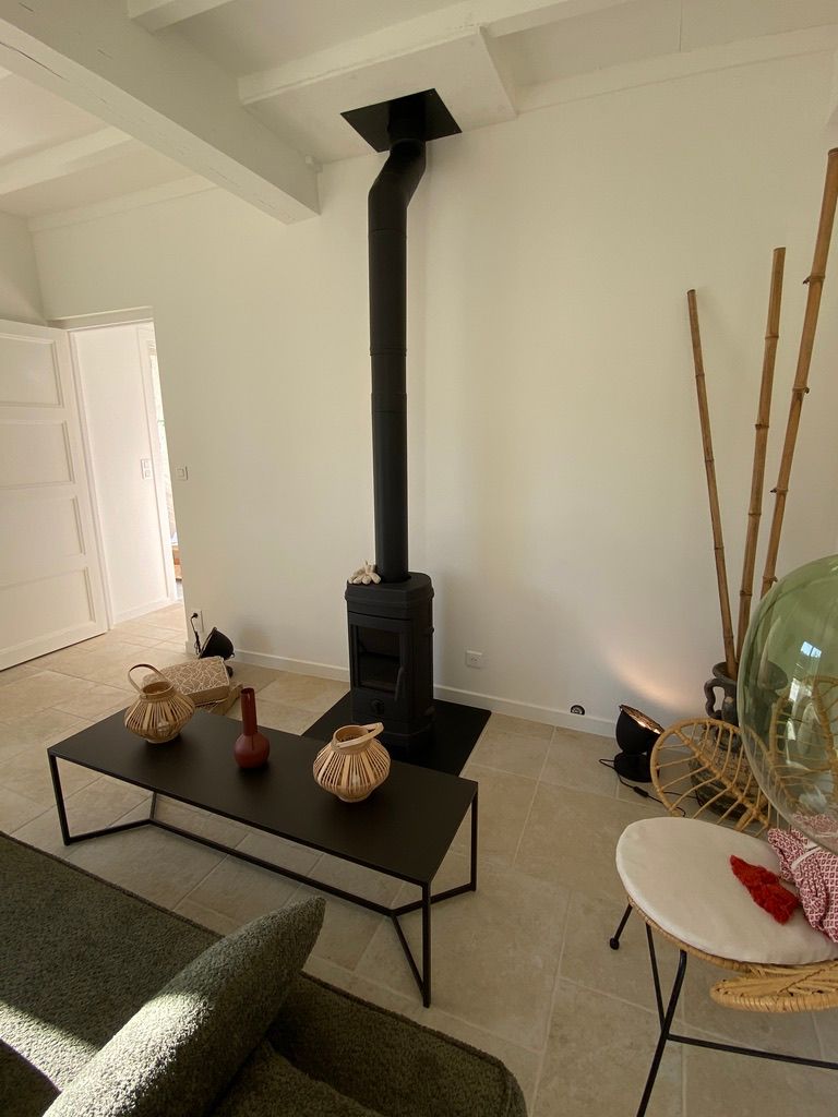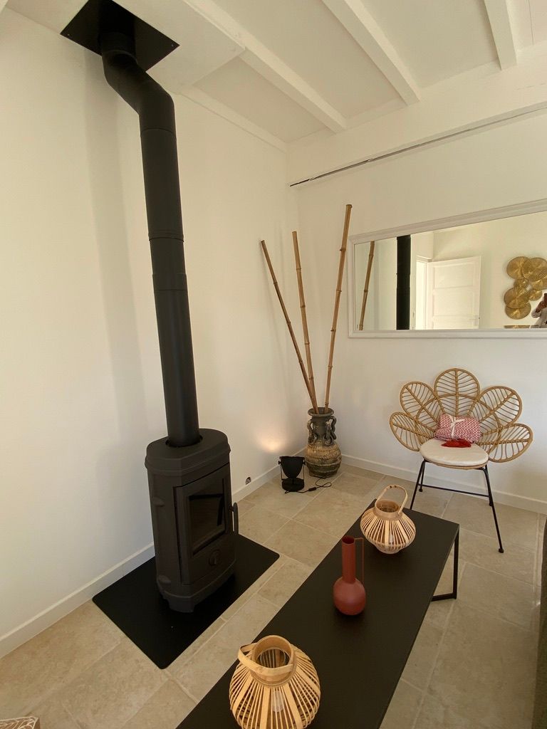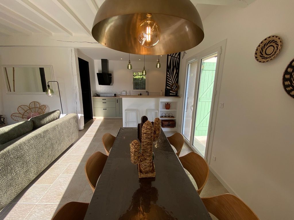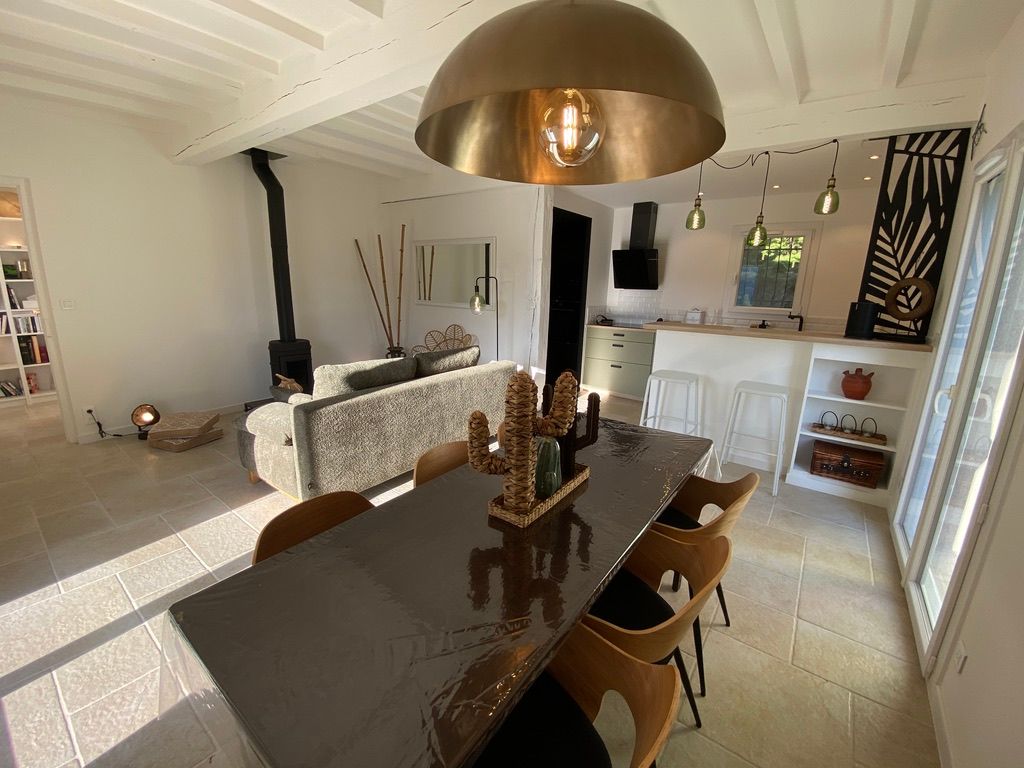– une pièce à vivre avec salon (canapé, table basse, poêle à bois (fourniture du bois compris dans le prix) fauteuil, table de salle à manger avec 6 chaises), cuisine ouverte toute équipée avec bar et tabourets (lave-vaisselle intégré, plaque à induction, hotte, robots) et sa zone technique (four, micro-ondes, combiné lave-linge, sèche-linge, réfrigérateur, congélateur),