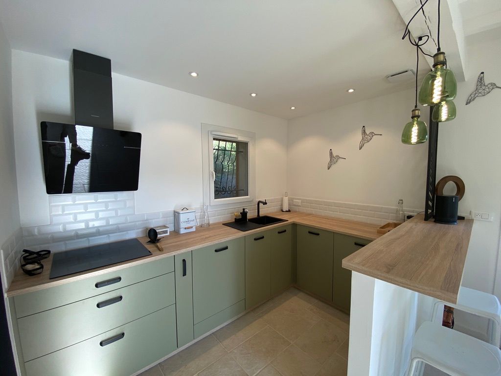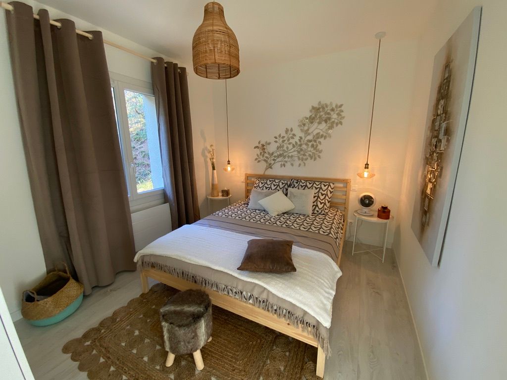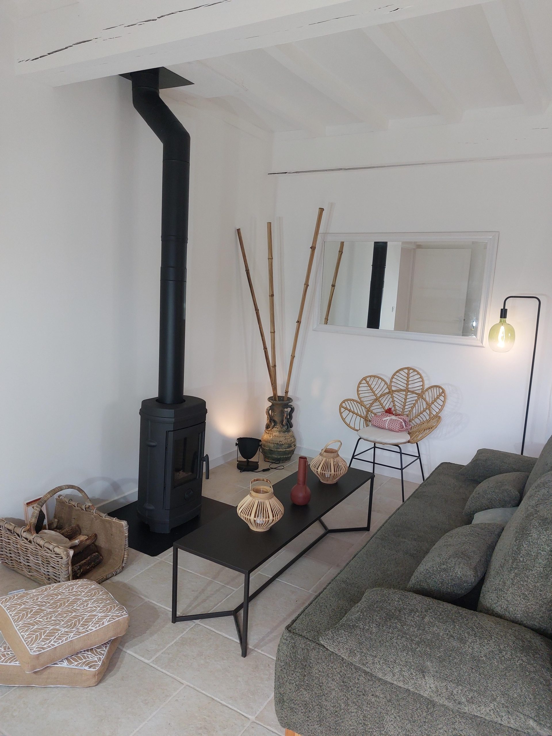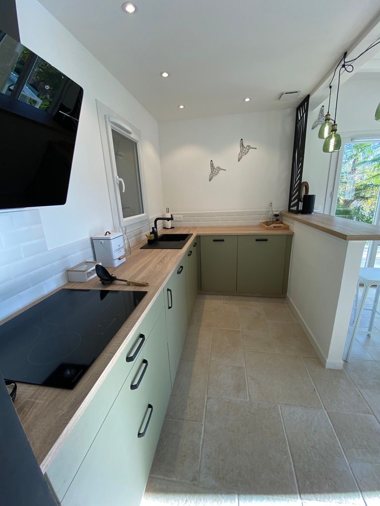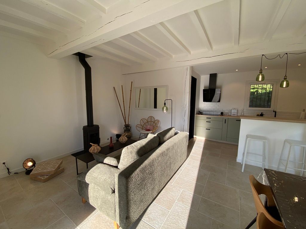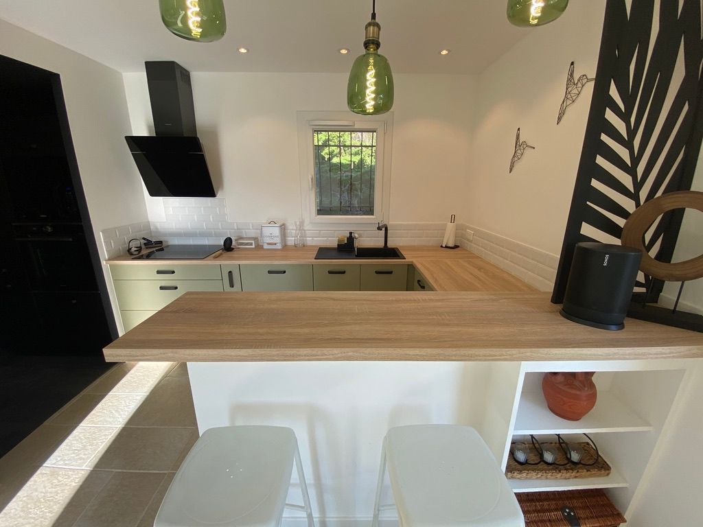 – une pièce à vivre avec salon (canapé, table basse, poêle à bois (fourniture du bois compris dans le prix) fauteuil, table de salle à manger avec 6 chaises), cuisine ouverte toute équipée avec bar et tabourets (lave-vaisselle intégré, plaque à induction, hotte, robots) et sa zone technique (four, micro-ondes, combiné lave-linge, sèche-linge, réfrigérateur, congélateur),