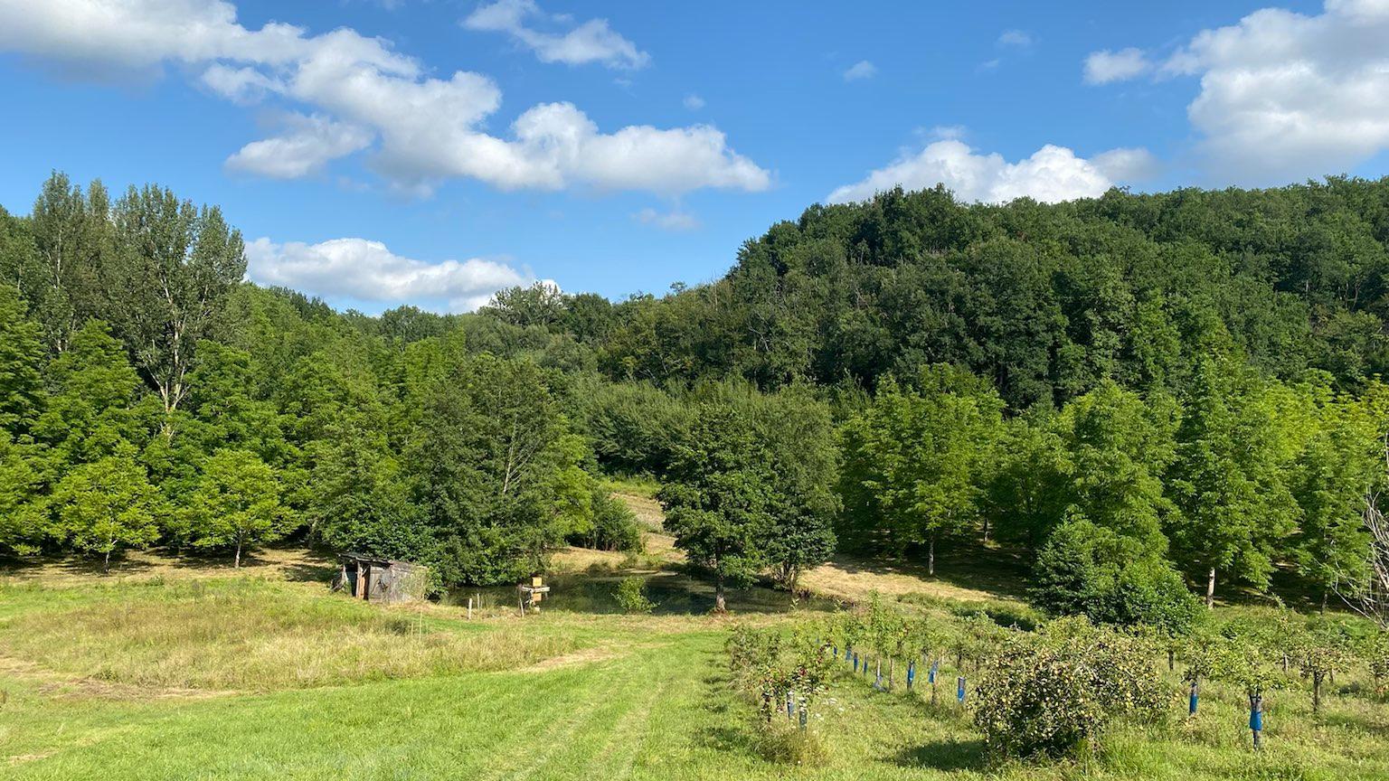 Arpenter nos 13 hectares de bois avec ses 5 km de chemin de randonnées et les 7 hectares de notre exploitation : un verger bio et des animaux de la ferme (ânes, brebis, chèvres, poules etc).