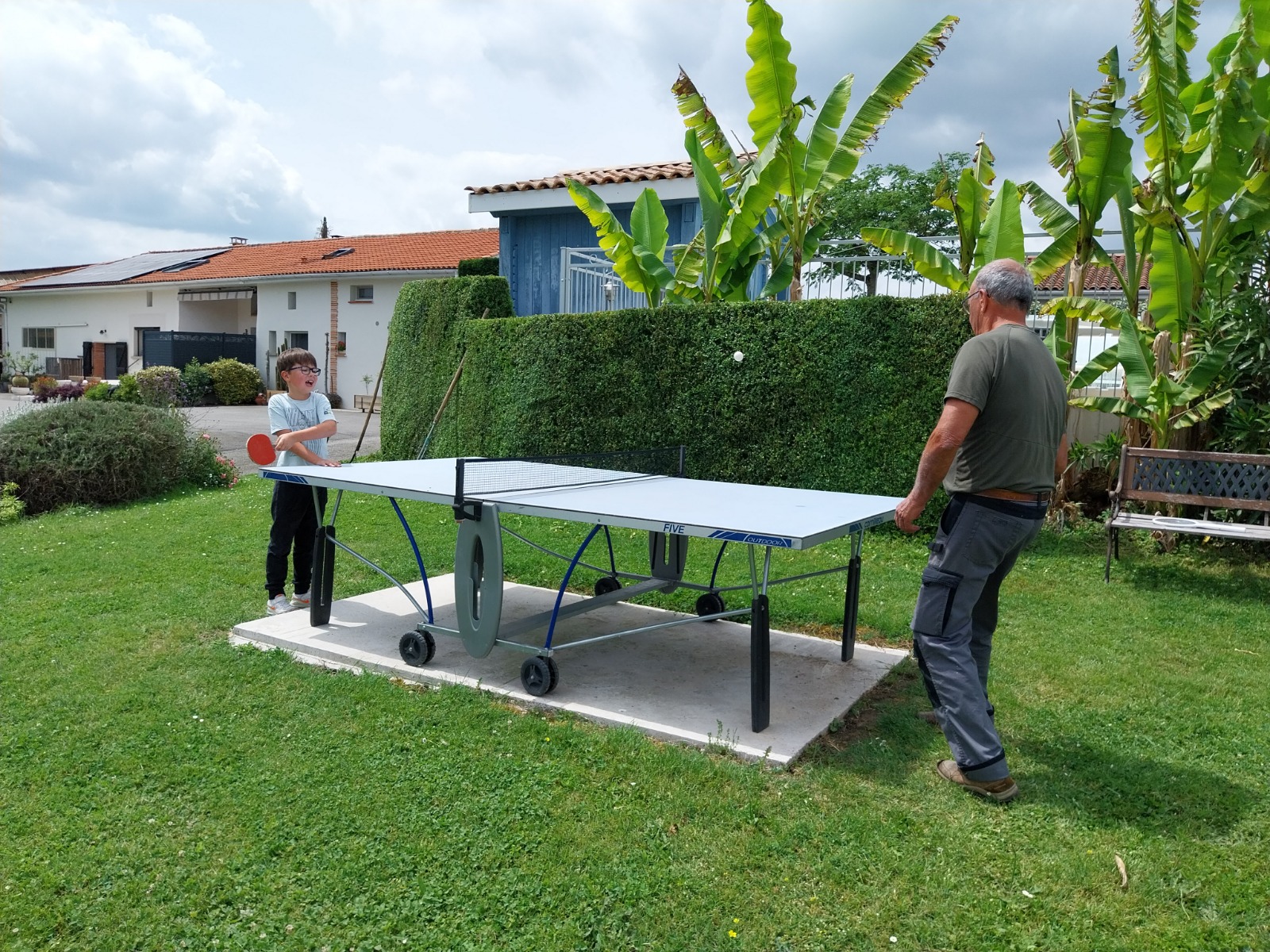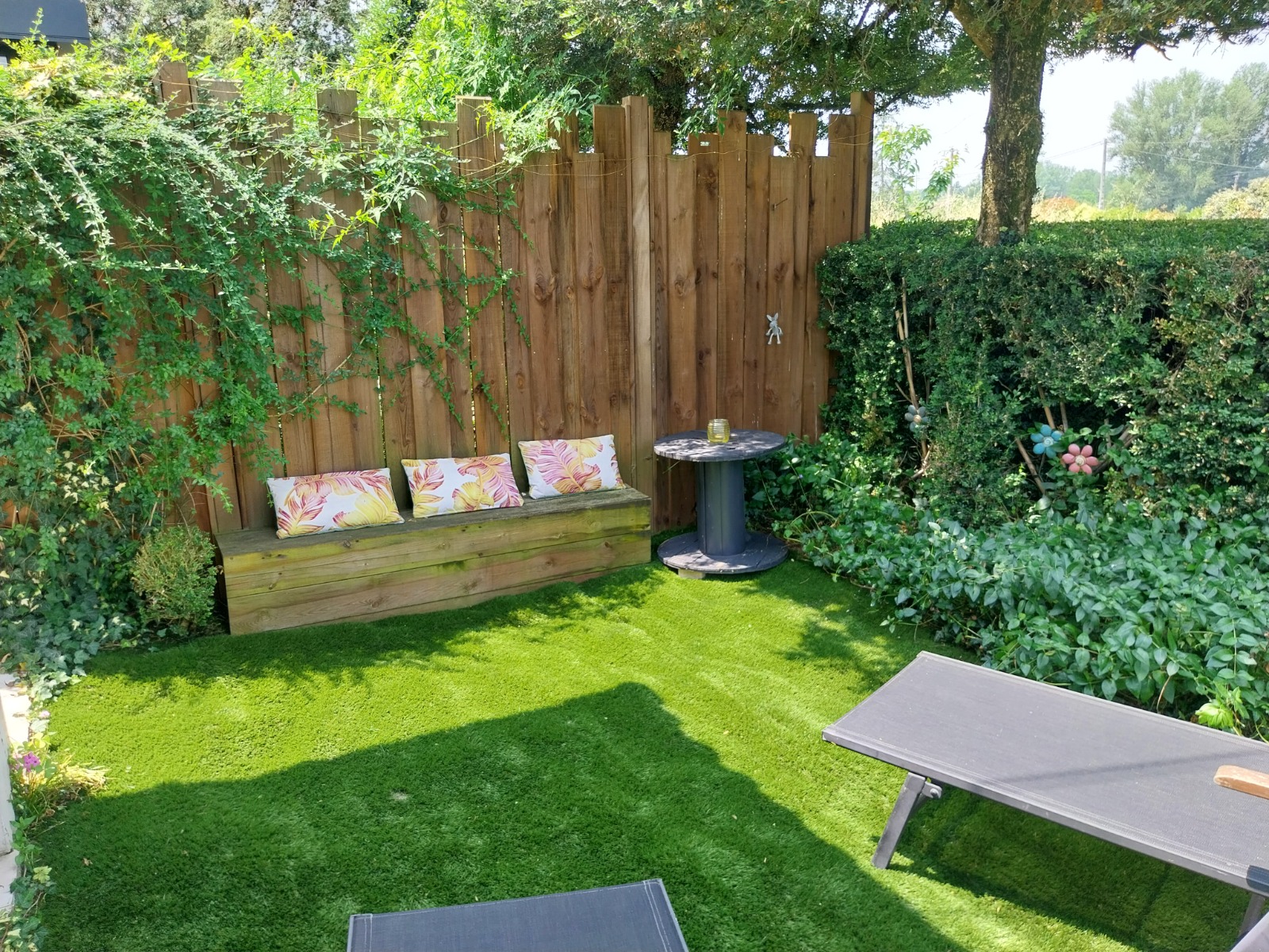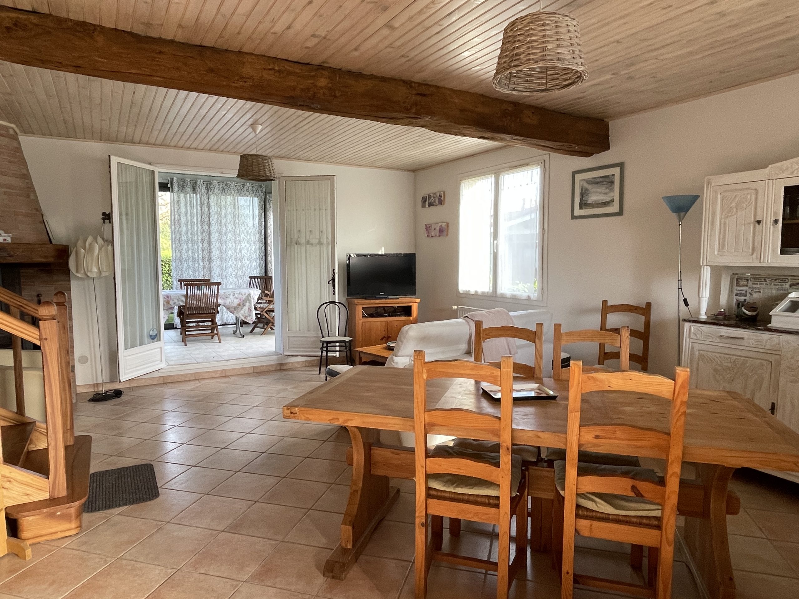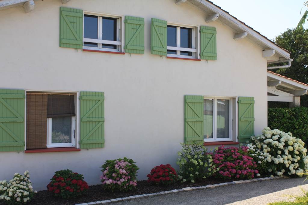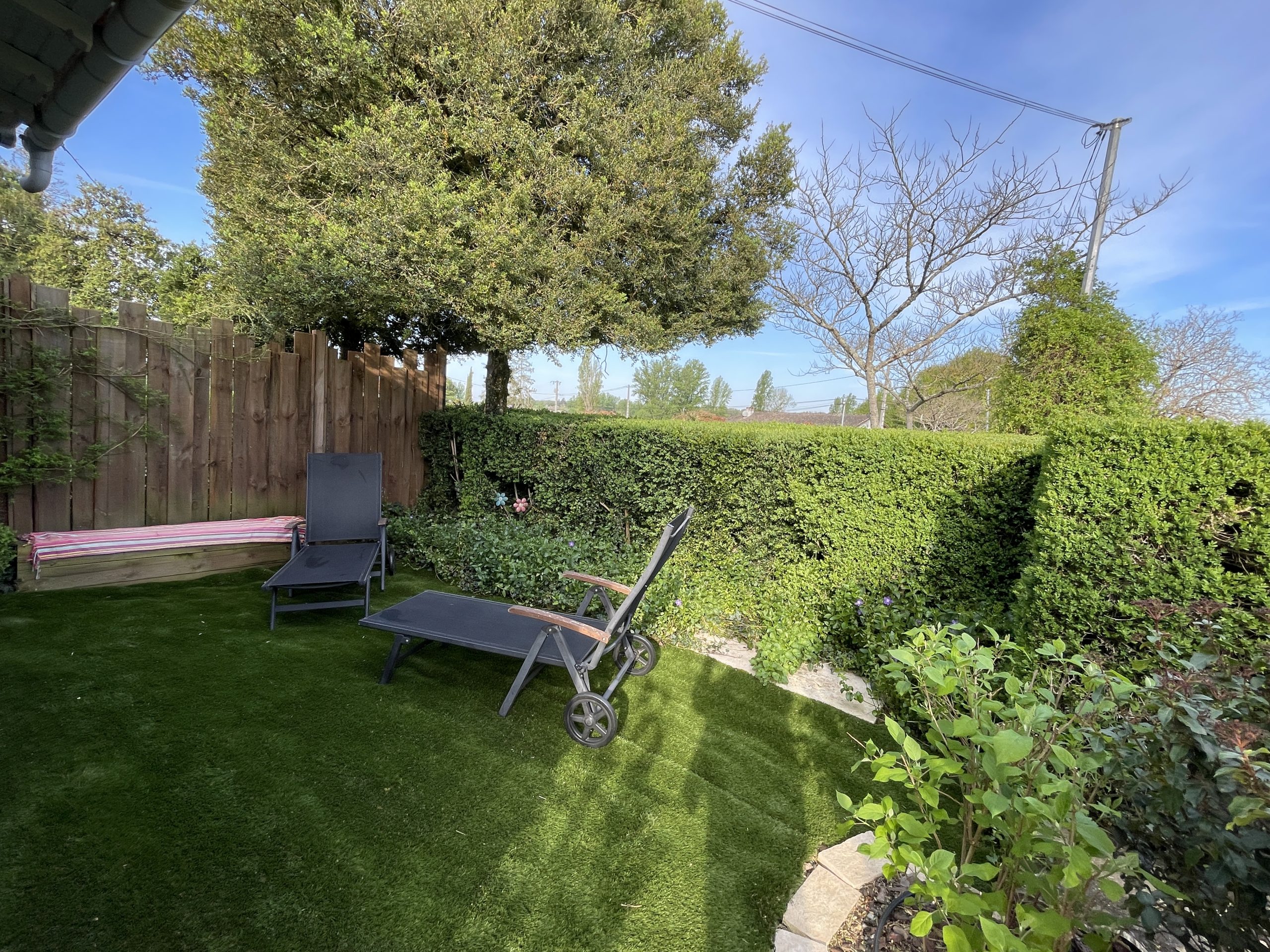 Une grande terrasse couverte entourée de buis complète le plaisir du séjour avec un salon de jardin, transats, barbecue.