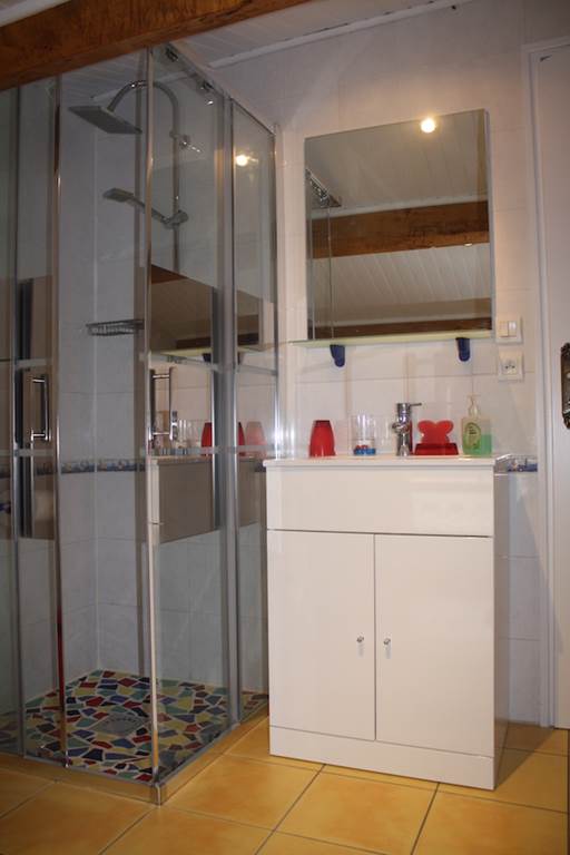 WC indépendant, buanderie. L’ escalier dessert les deux chambres climatisées avec vue sur la campagne, les fenêtres sont équipées de moustiquaire, salle d’eau avec fenêtre, sèche serviette rangement, toilette.