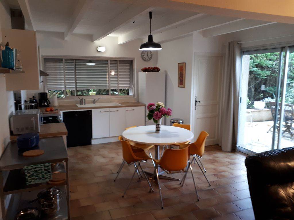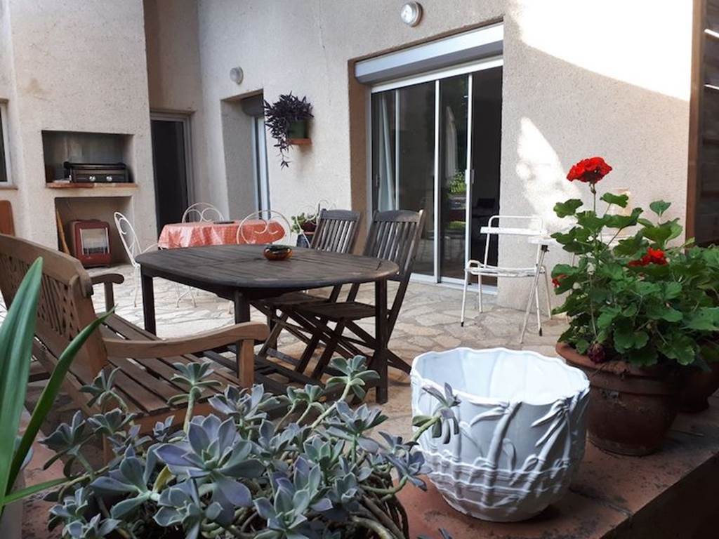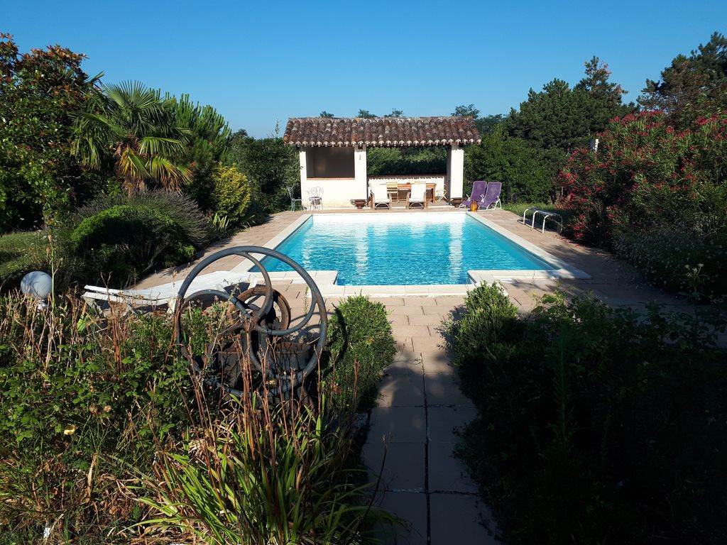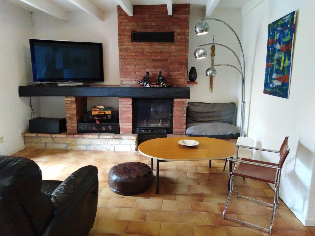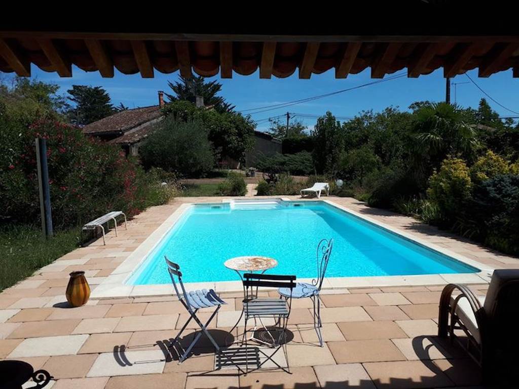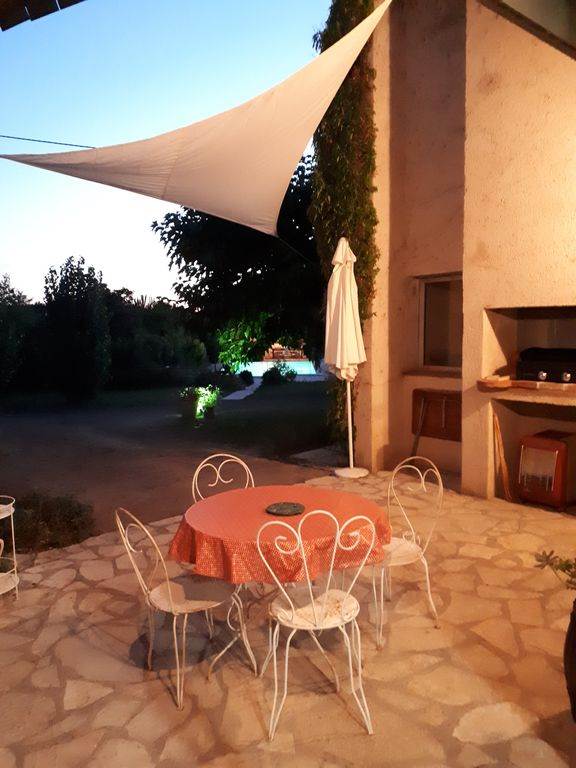 Coté repos, évocation des voyages, grand écran plat, cheminée, canapé, pouf… tout est cosy… et dépaysant. Grande baie vitrée qui donne sur une terrasse couverte (plancha) et piscine (5 x 10 mètres), est équipée de deux salons de jardin.