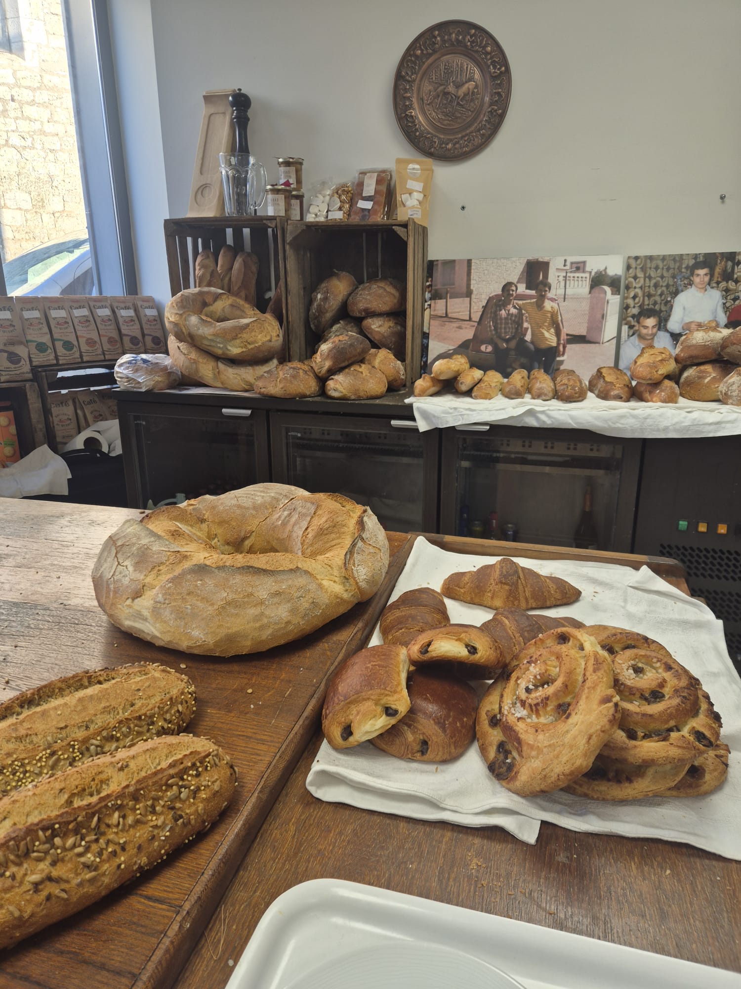 Dépôt de pain et viennoiseries venant de la boulangerie artisanale Loulou et Mat à Castelnau-Montratier : Baguettes traditionnelles, flûtes, miches de campagne, pains de seigle, pains aux céréales, croissants, chocolatines, et pains aux raisins, tous préparés avec des ingrédients de qualité.