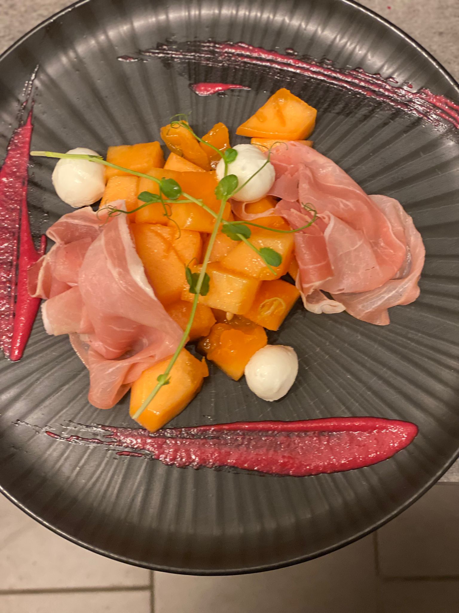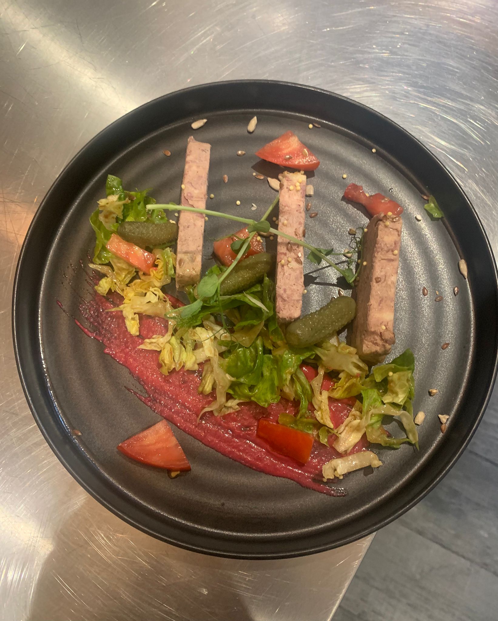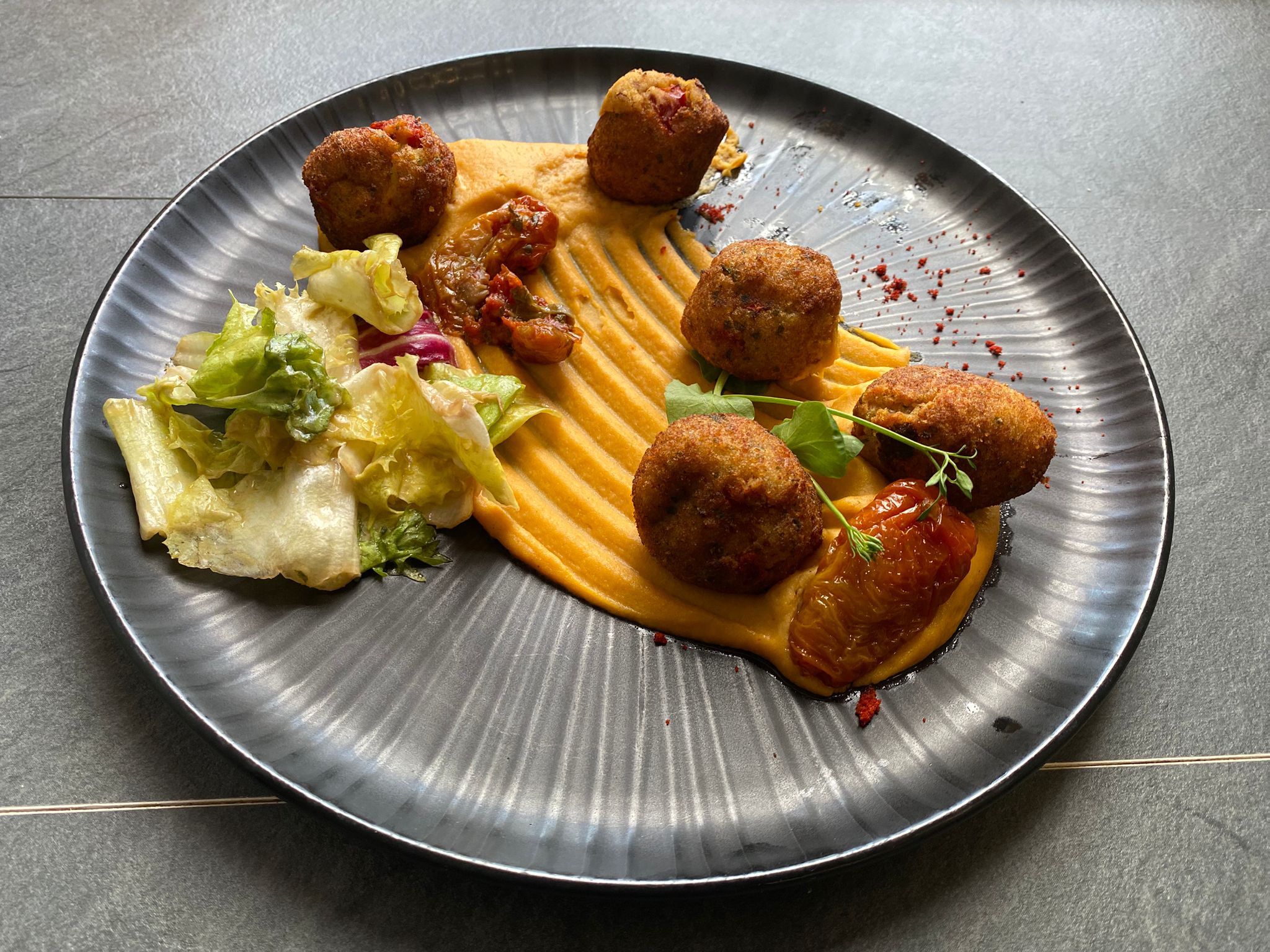 • Camembert rôti, jambon cru et salade