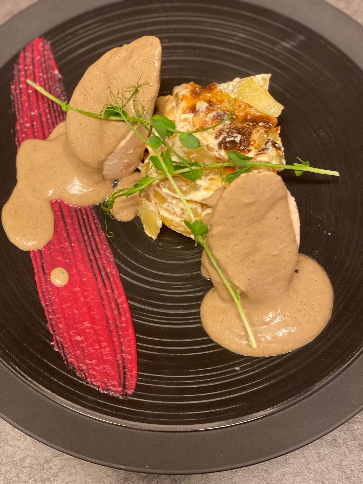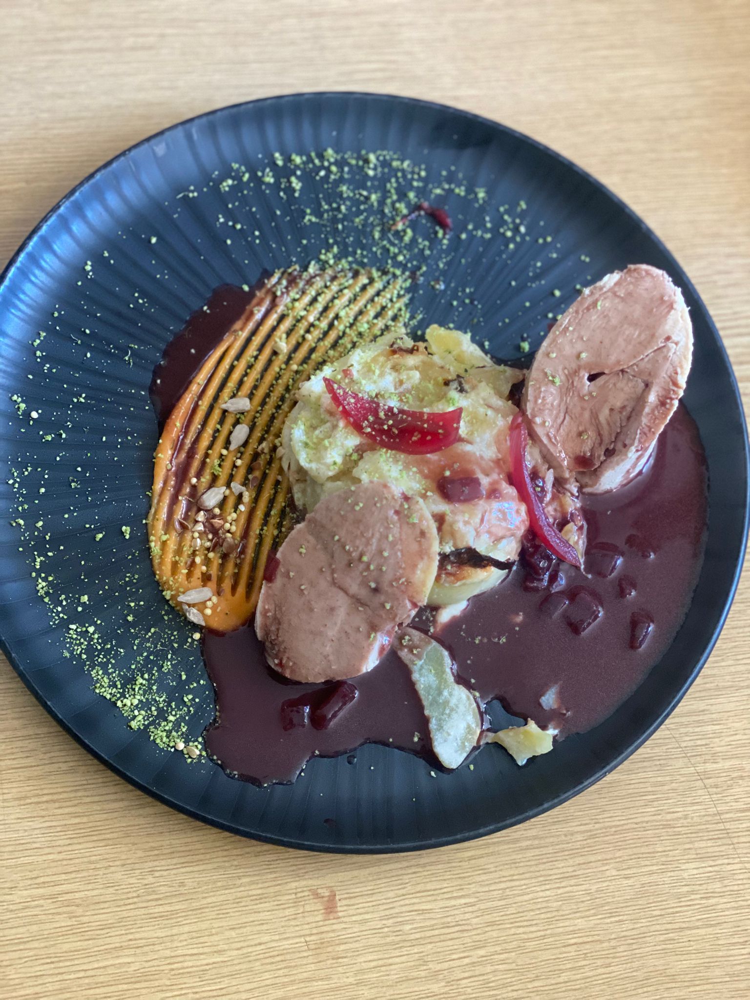 • Filet de magret de canard, gratin de pommes de terre, sauce au bleu