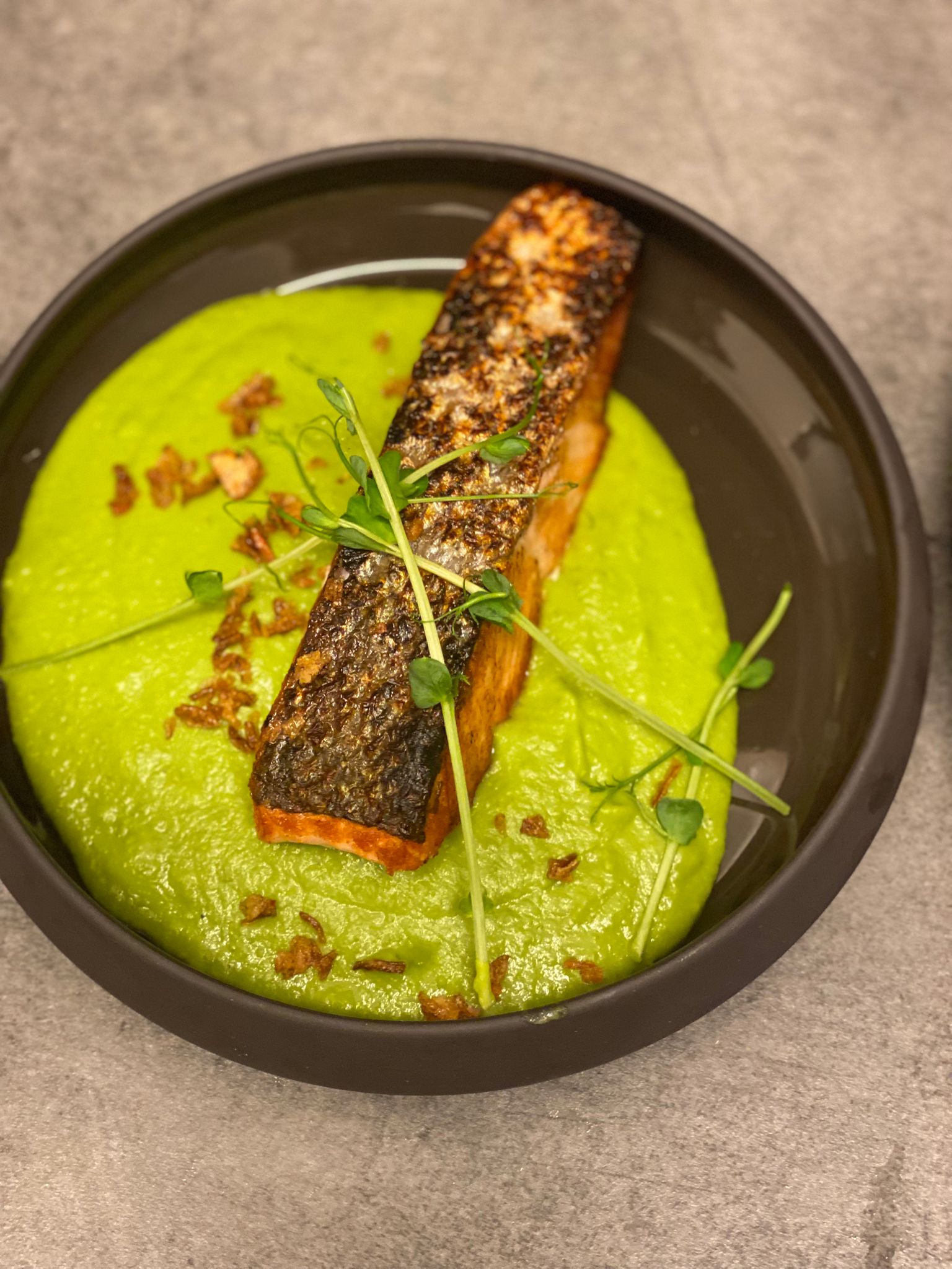 • Filet de lieu noir, crème de petits pois, sauce champignons