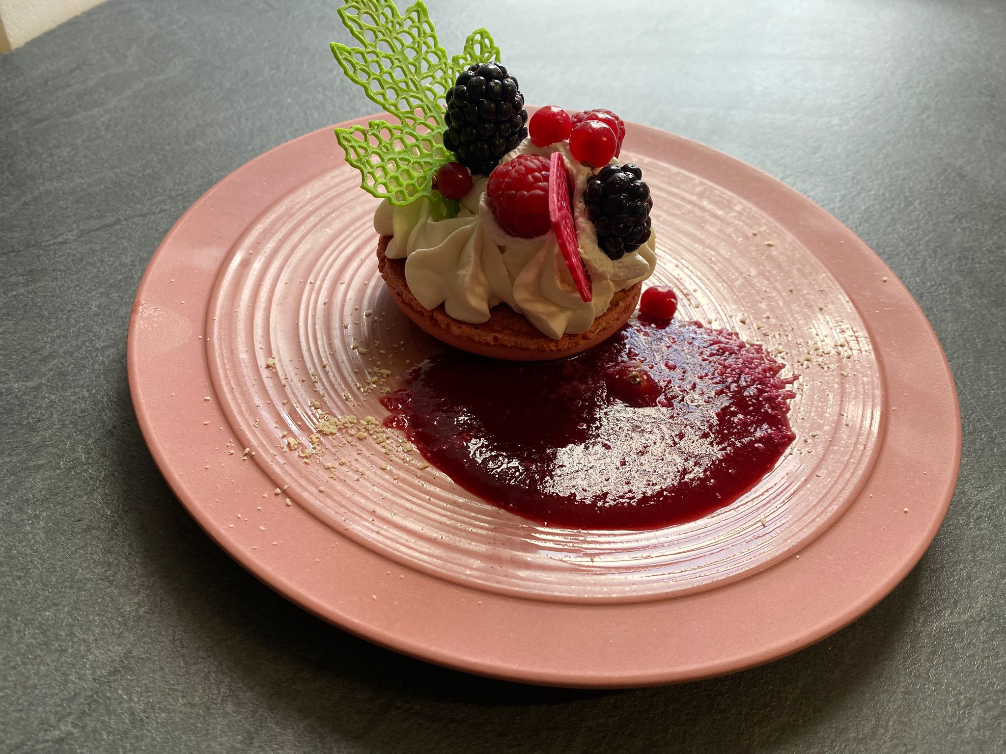 • Pavlova aux fruits rouges, sorbet fraise