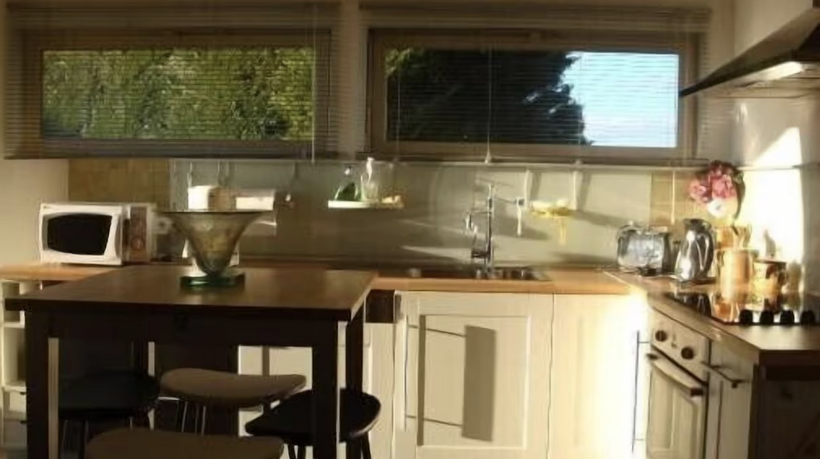 le coin cuisine avec tous les appareils ménagers. Une arrière cuisine pour servir de cellier. Les saisons plus fraiches il est possible de chauffer (chauffage par le sol avec pompe à chaleur)