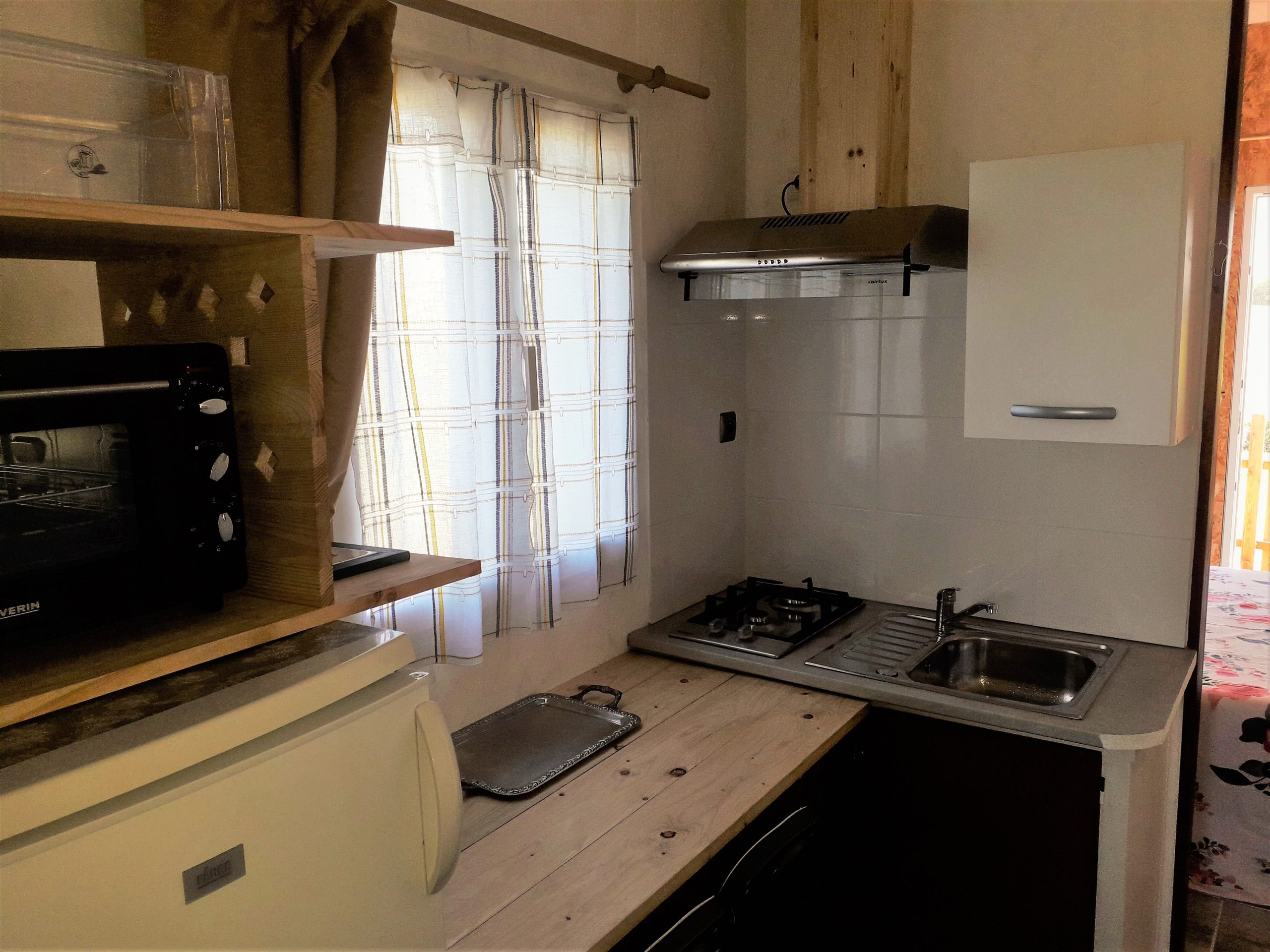 Pour vos provisions un grand réfrigérateur, four et cafetière électriques et classiques, plaque deux feux gaz (gaz fourni).