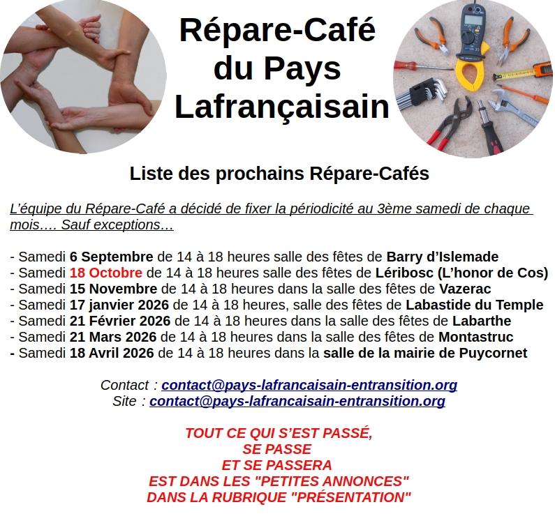 Le samedi 21 février de 14h à 18h, le Pays Lafrançaisain en Transition organise un Répare-Café à la salle des fêtes de Labarthe.