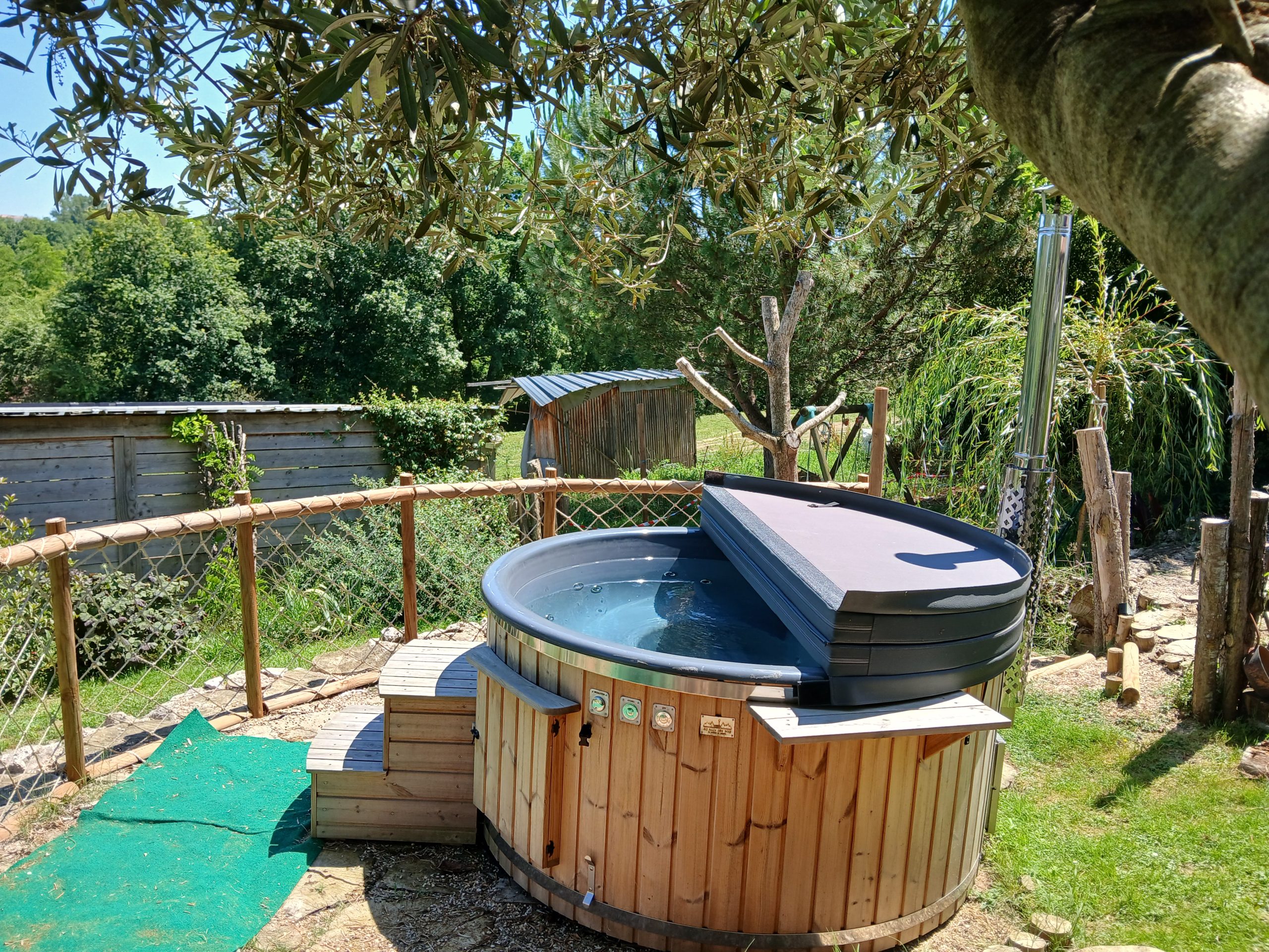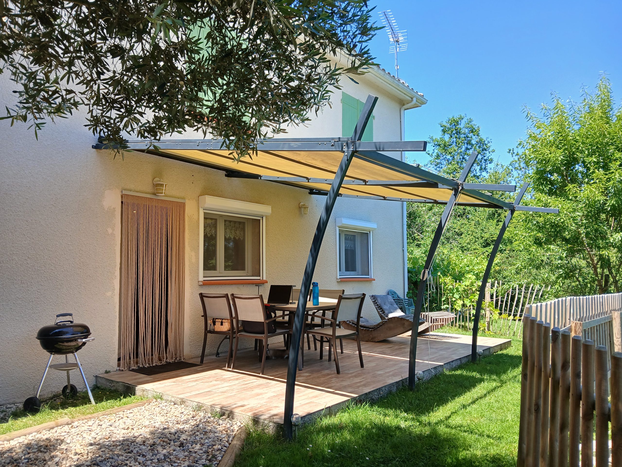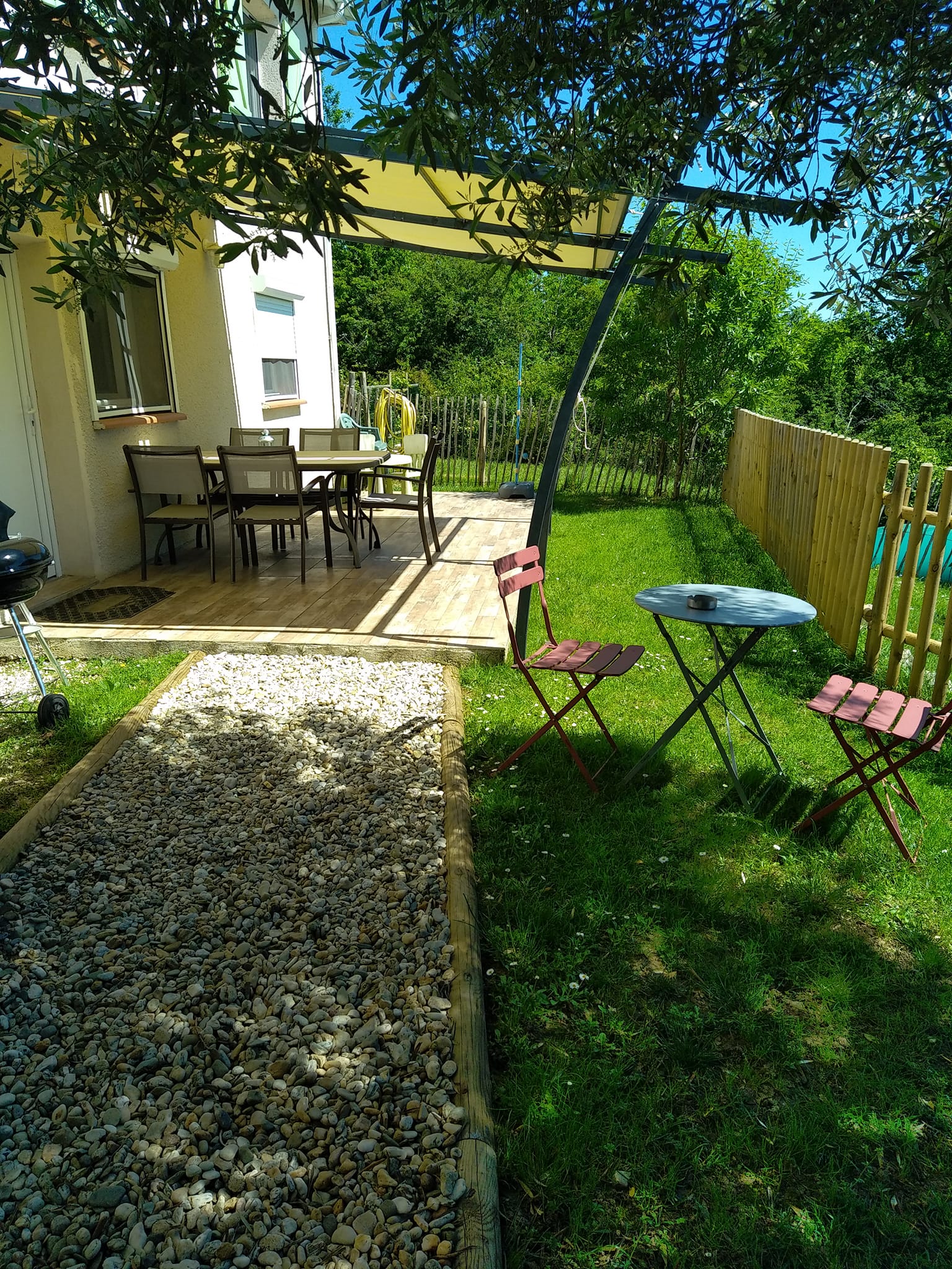 Le gîte dispose d’un emplacement privatif à l’arrière de la maison, comprenant une terrasse et un jardin sans vis-à-vis. Vous y trouverez un salon de jardin avec transats, un barbecue, le tout ombragé grâce à la pergola. Un bain nordique est à votre disposition pour une relaxation optimale ainsi que des jeux extérieurs pour enfants.