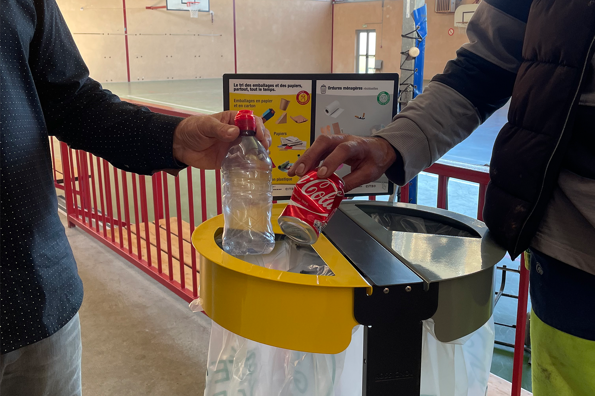 Dans un premier temps, les agents du SIEEOM et les municipalités ont équipé les salles communales puis, dans un second temps, les corbeilles de rue seront soit doublées, soit remplacées par des équipements « double flux » pour pouvoir faire le tri partout et tout le temps. À noter que même si elles sont plutôt rares en dehors de la maison, les bouteilles en verre vides doivent être recyclées dans les colonnes à verre les plus proches que vous pouvez géolocaliser grâce à l’appli gratuite GUIDEDUTRI.