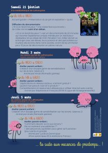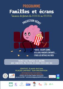 - Atelier parent-enfant (pour petits et grands) : « Comment devenir accro aux écrans ? Est-ce vraiment une addiction ? » – Astuces du quotidien pour gérer sa frustration, animé par Lucile et Dominique (Proxi santé Apas 82 & Addictions France)